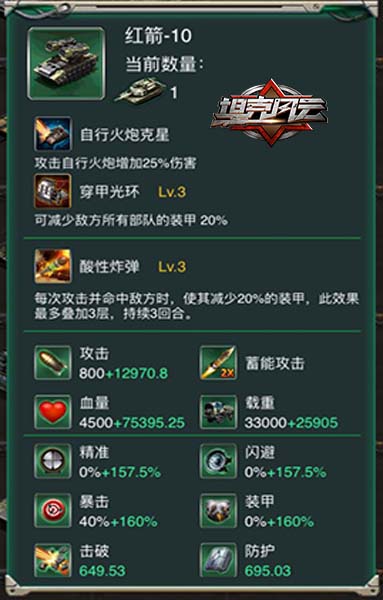 今天给大家带来的是一款由雷尚科技有限公司研发的军事题材SLG手游《坦克风云》的内容放送。游戏运营至今,《坦克风云》中多款强力坦克正逐渐解开面纱,红箭-10系反坦克导弹发射车作为我国在世界舞台上闪耀的新星,当然也在《坦克风云》中如期与大家见面了。 红箭-10反坦克导弹是我国近年来装备的远程多用途导弹,该导弹采用光纤制导,人在回路中控制,车内有两个操纵台可同时控制两枚导弹。导弹射程10公里以上,采用攻顶模式可以有效摧毁任何现役主战坦克 原型特性: 火力覆盖面广 与红箭-9反坦克导弹相比,红箭-10反坦克导弹有两点提升最为显著,一是导弹的射程大大提高,从红箭-9的5公里,一跃至10公里,增加了一倍的距离,这在当下反坦克作战中的优势非常大。 战场狙击手 红箭-10导弹是中国最新型的重型反坦克导弹:任何企图赢得决斗的坦克都将会被其以巨大优势超越。红箭-10导弹发射车采用的是ZBD-07装甲底盘,上面装载8枚导弹。红箭-10导弹的射程为10公里,从而使它如同一个置身安全地带、逐个击毁敌方坦克的反坦克狙击手。 直升机杀手 据悉,红箭-10是多用途光纤制导重型多用途导弹,正式型号为AFT-10。有分析称,红箭-10并非传统意义的反坦克导弹。它是一种光纤制导的车载重型多用途导弹,可以打击多种目标。 《坦克风云》中红箭10特性 光环: 自行火炮克星: 红箭10的广角火力覆盖面及其强大的火力输出奠定了其再《坦克风云》中火力担当的角色,作为一款火箭车,其先天优势在于克制自行火炮,红箭10对所有场上的自行火炮均增加25%伤害! 穿甲光环: 装载了红箭10型号的反坦克导弹发射车最明显的特点即无事对方装甲!只要红箭10出现在战场上,敌方所有作战单位均降低20%装甲,任何单位装甲在它面前犹如纸质,不堪一击! 酸性炸弹: 红箭10每次攻击并命中敌方时,均可使对方降低20%装甲,最多可叠加三层!通过简单的加减计算我们可以得到一个可怕的数据!红箭10每次对对方六组作战单位均会造成伤害,削减对方装甲数值堪称恐怖!堪称《坦克风云》最强之矛! 评价: 火力:☆☆☆☆☆ 装甲:☆☆☆ 性价比:☆☆☆☆ 实用性:☆☆☆☆☆ |