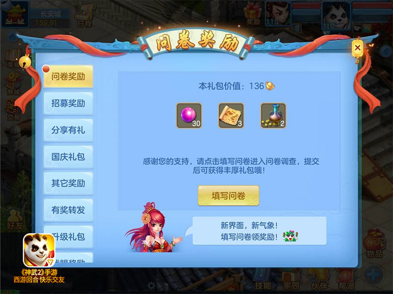 《神武2》手游本周五将新增安卓、iOS跨平台新服“绝代天骄”。《神武2》手游全新内容“群雄问鼎”已全面开启,新宠物、新剧情、新UI、门派转职等丰富内容现已和玩家见面,天梯排位赛、新坐骑等更多精彩内容也即将重磅来袭!游戏内还有调查问卷礼包、国庆礼包等大礼等你来拿!多重礼包,各色福利,尽在《神武2》手游! 【扫描二维码,免费下载神武2手游】 全新UI界面 全新的UI界面画风清新,从主画面、功能界面、图标等方面都做了改变,崭新的视觉体验一定能给玩家更愉快的游戏感受。 调查问卷礼包 《神武2》手游更换全新UI界面。在2016年11月24号24点前,玩家在奖励界面填写一份调查问卷,反馈对新界面的意见,将获得系统赠送的礼包一份。 国庆礼包 《神武2》手游国庆礼包正式开放,免费礼包快来领取!累计登陆游戏3天,活跃度达到900以上的玩家即可在游戏内奖励界面免费领取国庆礼包!同时还有两档优惠礼包购买,通灵符、高级通灵丹、高级宠物装备在等着你! 《神武2》手游,2016优秀社交手游来了!《神武2》手游全新内容“群雄问鼎”来袭,桃源仙境遇新宠,转职排位会群雄。新宠物,新地图,桃源仙境邂逅奇缘;酷炫双人坐骑,与好友共乘畅游三界;全新排位赛、门派转职系统开启,群雄争霸,谁能问鼎?《神武2》手游玩法丰富,系统创新,便捷的即时语聊、智能离线保护、自动组队等功能一定让你爱不释手!《神武2》手游还是一个强大的娱乐交友社区,选美赛,好声音赛,好友秀互动,游戏交友两不误。西游回合,快乐交友,尽在《神武2》手游。 了解更多相关信息,请前往http://sw.yzz.cn/sy/ |