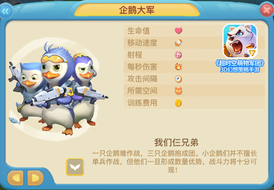 相信很多朋友都看过《神奇动物在哪里》了吧,电影里小雀斑的皮箱里有着各式千奇百怪的动物们,让人大开眼界。在《超时空萌物军团》中,也有这么一群神奇的动物,为了拯救超萌星,他们纷纷拿起了武器。今天就让我们来看一看超萌星的这些动物们各自有着什么样的能力吧! 企鹅大军——人多就是力量 企鹅军团是超萌军团的中距离作战部队,也是最基础的战斗部队,手持冲锋枪的他们会在危险的前线进行战斗。 团结是超萌星的企鹅们赖以生存的准则,喜欢抱成一团的他们在战场上也同样坚持着“人海战术”,数量碾压是企鹅大军最大的特点。虽然他们武器威力一般,也不是个合格的肉盾部队,但是正所谓双拳难敌四手,如果让企鹅们形成了规模,绝不是一股可以小觑的力量。在战场上,可以进行区域攻击的设施是企鹅大军的天敌,如果能够成功清理掉或者控制住这些烦人的武器,这些团结的小家伙们会告诉你什么叫“企鹅过后,寸草不生”。 坚盾熊——靠谱不光动嘴 白熊一族向来是以强壮而稳重闻名超萌星,他们组建起了超萌军团的坚盾熊部队。重装机关枪,合金盔甲,嘴上还叼根子弹,这种形象不知道迷倒了多少超萌星的小姑娘。在巴顿长官的带领下,坚盾熊部队成为了超萌军最靠谱的的攻坚力量之一。 作为真男人部队,坚盾熊们永远是出现在第一线的战场上与敌人近距离厮杀,壮硕的身躯与厚实的盔甲给予了他们强大的抗击打能力。有坚盾熊顶在前方,远程部队才能安心的输出。但是由于体形庞大,每一次能够出战的坚盾熊的数量会有所不足,因此,一旦坚盾熊被单点能力极强的武器击退,那么躲在他们身后的企鹅大军和火炮兔们也就成为了待宰的羔羊,所以能否合理的指挥这些靠谱的壮汉们也是对指挥官战术能力的一个重要考验。 火炮兔——距离决定成败 超萌星上的兔子火炮团是超萌军团里最靓丽的风景线,不过小瞧她们可是要付出惨痛代价的,她们手里提着的,可不是装饰用的玩具,而是可以统治战场的危险武器。 萝卜火炮是火炮兔军团的专配武器,它具有超远的射程,威力也是相当的不俗。很多时候,火炮兔可以在敌方的射程之外进行进攻。明明看得到,却怎么也打不到,这样的糟糕感觉对敌人的士气也是一种打击。不过,兔子们瘦弱的身躯很难抵挡战火的摧残,所以想要让火炮兔们真正的发挥出火炮的威力,就一定要保护好她们,让她们远离可能被攻击到的区域。针对那些有远距离防御能力的设备,派出坚盾熊部队吸引火力也许是一个很好的选择。 这三支各具特色的部队可以帮助《超时空萌物军团》的玩家应对前期各种难关,合理的兵种应用会让以弱胜强不再是幻想。12月16日,《超时空萌物军团》安卓平台删档测试就会正式开启,神奇的动物们正翘首等待各位指挥官的降临。 了解更多相关信息,请前往http://sy.yzz.cn/ku/cskmw/ |