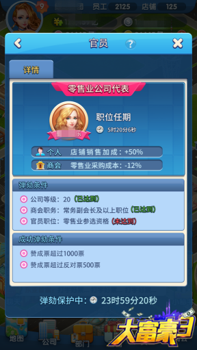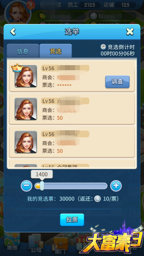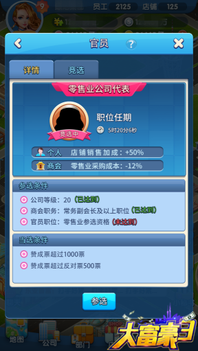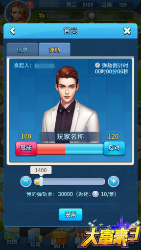 年度首款超现实模拟经营商战手游《大富豪3》实现了玩家人人都可以当董事长的梦想,而有追求的董事长们自然不会仅仅将做一名土豪作为人生的终极目标,这时候竞选官员获得“权钱交易”的机会就成为绝佳的选择了! 官员选举分为行业选举和区域选举两大类,玩家只能在一个大类中选举一个职位,满足参选条件后,即可报名参加官员选举。选举结算中满足当选条件,则当选相应官员职位,可获得配置的特权加成。 玩家首先要通过消耗公司现金为参选的自己加资的方式获得参选资格,之后能否当选则需要依赖全服玩家的投票。因此,想担任官员职位的玩家,除了要拥有强大的经济实力,还需要在游戏的过程中,注意多协助信任、结交朋友,让更多人把选票投给自己获得支持。这是一个对财力、外交的双重考验。 所谓“知己知彼,百战不殆”,如果竞选中的玩家想要清楚地了解到竞争对手的投入的竞选基金和票数,玩家可以根据自己的需要消耗金币进行调查,调查显示的内容只有调查者本人才可以查看,这种信息对于玩家及时拉票有极大的帮助。 值得注意的是,如果玩家有特别心仪的职位被其他玩家占据,在该官员弹劾保护期外(当选后根据配置将获得一定时间的保护期),满足弹劾条件后,玩家可对在任的官员发起弹劾。弹劾结算中满足弹劾条件,则该官员卸任,官员职位空出,这时候玩家就可以乘虚而入!如果玩家此时能利用自己在游戏中结交的朋友一起弹劾,那么弹劾成功的概率将会提升不少,正所谓“在家靠父母,在大富豪靠朋友啊”! 了解更多相关信息,请前往http://sy.yzz.cn/ku/dfh3/ |