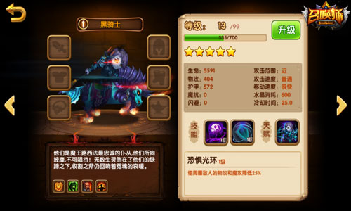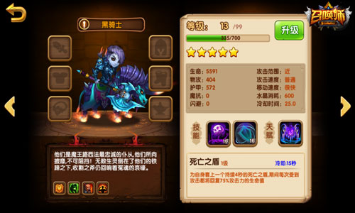 死亡黑骑士曾经是正义的人民,他们曾经勇敢而无畏地对抗黑暗,但他们与之对抗的邪恶并非轻易就能驱逐。死亡之力将战死的英雄唤醒,赋予其近似永恒的力量。这些曾经的英雄披上更加强大的装甲,操纵着所向无敌的黑暗魔力,去进行他们曾经与之对抗的一切暴行。 我们来看看黑骑士的基础属性,基础属性基本对得起所消耗的召唤水晶,生命属于最强一级别,还有物攻和护甲也达到了较高水平,移动速度可是很快的哟,在战场上基本就是一个能打能抗的存在,瞬间插入战场,拥有改变战场形式的能力。 死亡黑骑士的速度有多块咱们看图说话,寒冷的盔甲包裹着火热的心,如一道流星穿过,直插地方心脏。再来看看技能属性,使周围敌人物攻和魔攻均降低25%。为自己讨一个盾,受到攻击即可回复75%攻击力的生命。这就叫霸道,一边削弱你,一遍打你,还给自己回血,友谊的小狗说死就死!!! 别忘了,咱们可是死亡黑骑士,当然天赋也是极其强大的,降低敌方50%护甲!附近有死灵族单位死亡即可增加生命上线50%!最厉害的来啦!死亡冲锋:冲锋过程中对沿途敌人造成200%攻击力物理伤害,对有诅咒的单位造成300%的真实伤害并且有5秒眩晕。 黑骑冲锋秋叶落,铁甲冰冷心灼热,心有不甘痛轮回,有泪只为正义落。 了解更多相关信息,请前往http://sy.yzz.cn/ku/zhsfh/ |