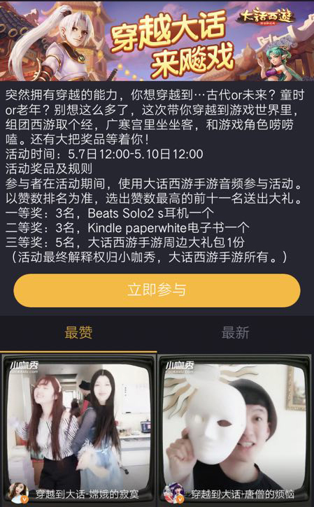 近日,《大话西游》手游首度联合国内顶尖搞笑视频分享平台“小咖秀”,带你穿越大话与鸡驴大神同框飚戏。“嫦娥的寂寞”、“唐僧的烦恼”、“牛魔王情变”各种趣味主题,全面释放的表演细胞!与鸡驴大神同场飚戏,更有Beats 耳机、Kindle电子书以及限量游戏周边礼包等你来赢。心动么?快来秀出你的演技! 携手小咖秀 创意活动“大话邀你穿越飚戏” 继表情包征集大赛之后,《大话西游》手游再推创新互动合作主题活动,“穿越大话来飚戏”带你和鸡驴大神同框飚戏!你才艺出众、浑身是戏,你颜值爆表,却没有表现自己的平台?这一次,《大话西游》手游将首度联合知名视频互动平台“小咖秀”,邀你“穿越大话来飚戏”! 此次创新合作活动,也是《大话西游》手游首次联合知名视频APP“小咖秀”,将游戏文化融入生活的又一次创新尝试。以玩家们喜爱的人物角色以及世界观为主题,“穿越大话来飚戏”专属活动不仅更能激发玩家创意的参与形式,也将让玩家们感受到互动参与度与趣味全新升级的独特体验。 5.7日12:00-5.10日12:00活动期间, 录制并上传你的专属飚戏视频,即有机会成为大话“最佳男(女)主角”!活动期间,收获玩家点赞次数最高的前十一名玩家,还将分别获得“大话影帝”的大话西游手游周边大礼包、Kindle paperwhite电子书,以及Beats Solo2 s耳机在内的丰厚实物奖励!还在犹豫么?快来秀出你的演技! 享赛事专属特权新服成长好礼 “所向披靡”新服等你来 五月,《大话西游》手游两大PK赛事即将震撼来袭,众多新服福利等你来体验!“所向披靡”新服虚伪待君至。玩家达到0转80级,即可专享新服特权,免费体验“无差别PK赛”,成功报名“无差别PK赛”的前100支队伍,队中所有队员还可获得“为战而生”专属限时称谓! 即刻预约《大话西游》手游,微信分享邀好友一同体验新服,等级上升至50级并绑定手机,即可与好友共享抱团豪礼!参与玩家抱团达到100级,还可领取专属称谓。玩家每日达到一定活跃度,海量游戏道具礼包、炫酷的限时装扮特效、限定头像框,等你来抽取!连续签到还可获得坐骑体验券,造型酷炫、战力升级的坐骑将带你游遍大话世界! 和“鸡驴大神”同框飚戏,更有Beats 耳机、Kindle电子书以及限量游戏周边礼包等你来赢,《大话西游》手游联合小咖秀“穿越大话来飚戏”创意活动火爆进行中,喜欢表演的你,快来秀出你的颜值与才艺吧!更多游戏信息,请关注《大话西游》手游官网、官方论坛。 了解更多相关信息,请前往http://xy2.yzz.cn/sy/ |