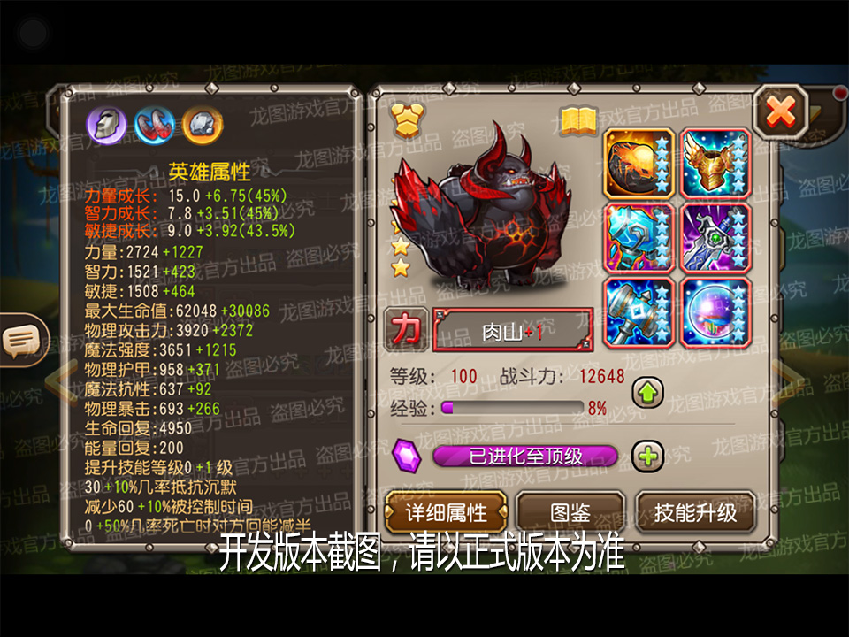 曾经的刀塔大陆上,围绕肉山大魔王和复活盾展开过一个又一个的经典战役,如今,沉睡万年的大魔王再次苏醒,一场传奇大陆的殊死保卫战即将爆发。5月《小冰冰传奇》霸气新英雄肉山登场,一起来了解这个远古魔物BOSS。 介绍视频: 【属性介绍】 90级博学院,100级红1满装满附魔属性 作为前排物理坦克类英雄,拥有超乎寻常的基础属性。三维过硬,其中力量属性更是碾压当前所有同类英雄,这让他拥有傲人的生命力和优秀的攻击力。同时出色的护甲、魔抗、生命回复属性更是为他的持久作战能力添砖加瓦。此外自身在减控上也是具备一定的优势。肉山具备多个范围伤害技能,并对敌人的行动产生限制,不朽守护技能更是向经典致敬,在开场时享有非常剽悍的属性加成效果。肉山大魔王终于暴怒入侵,相信战场上腥风血雨的搏斗即将拉开帷幕。 此外,肉山享受以下加成: 1.巨人——享受小小觉醒技能加成,可获得魔抗增强 2.恶魔之角——享受末日使者觉醒技能加成,可获得护甲增强 3.岩土系——享受大地之灵觉醒技能加成,可获得护甲提升 【技能介绍】 暴怒掀桌(大招):肉山陷入暴怒,将场景变换为火山地狱,在该场景下,肉山的所有技能都会获得加强,普攻攻击对每个目标都有溅射效果。肉山掀起面前的地板,对前方单位造成伤害并造成位移。 重锤(普通):肉山猛砸身边的地面,对周围敌人造成范围伤害,并将地面打出塌陷,敌人站在地面上超过一定时间,将会被地下喷出的岩浆击飞并造成伤害。在火山地狱下,岩浆伤害将更高,如果学习了“火药岩”技能,每次释放技能都会让背景火山喷发出一个火药岩。 火药岩(普通):肉山吐出体内高温的火药岩,火药岩被击破时会爆炸并会对周围敌人造成伤害,越早爆炸伤害越高。火药岩被肉山的技能或者其他火药岩的爆炸击中时会直接爆炸。在火山地狱下,爆炸范围更大伤害更高,且每次使用技能都会让背景火山也喷发出一个火药岩。 不朽守护(普通):肉山体内藏有不朽的守护,进入战斗时提升肉山一定百分比的攻击力,护甲及魔法抗性,并免疫大部分控制。但是,当肉山损失一定生命值时,将会失去免控效果,被敌人击杀时,对方将会获得不朽的守护,当对方死亡时,将会抵挡那次伤害并回复一定的生命值。 暴怒掀桌: 肉山陷入暴怒,将场景变换为火山地狱。 在该场景下,肉山的所有技能都会获得加强,普攻攻击对每个目标都有溅射效果。 肉山掀起面前的地板,对前方单位造成伤害并造成位移。 重锤: 肉山猛砸身边的地面,对周围敌人造成范围伤害,并将地面打出塌陷。 敌人站在地面上超过一定时间,将会被地下喷出的岩浆击飞并造成伤害。 在火山地狱下,岩浆伤害将更高。 如果学习了“火药岩”技能,每次释放技能都会让背景火山喷发出一个火药岩。 火药岩: 肉山吐出体内高温的火药岩,火药岩被击破时会爆炸并会对周围敌人造成伤害,越早爆炸伤害越高。 火药岩被肉山的技能或者其他火药岩的爆炸击中时会直接爆炸。 在火山地狱下,爆炸范围更大伤害更高,且每次使用技能都会让背景火山也喷发出一个火药岩。 不朽守护: 肉山体内藏有不朽的守护,进入战斗时提升肉山一定百分比的攻击力,护甲及魔法抗性,并免疫大部分控制。 当肉山损失一定生命值时,将会失去免控效果。 被敌人击杀时,对方将会获得不朽的守护,当对方死亡时,将会抵挡那次伤害并回复一定的生命值。 【站位介绍】 作为前排坦克类英雄,肉山站位位于前排靠前位置。自身的生命和防御属性非常出色,这让他更持久地伫立在前排为身后的队友创造舒适的输出空间。与此同时,他擅于创造火山地狱环境,利用熔岩和岩浆折磨对手,影响敌方的行动。不朽之守护更增加了对战的乐趣,到底是让己方的阵营势如破竹,还是成全对手强力的反扑,这就要看队长大大们如何搭配阵容喽! ★★出世即觉醒★★ 肉山在岩浆中汲取到无尽的能量从而获得觉醒能力! 队长大大们只要将他培养到90级橙,即可开启他的觉醒之旅咯~~ 觉醒图: 觉醒技能: 熔岩核心:肉山体内的高温核心即将破肚而出,所有从正面攻击肉山的敌人将会受到燃烧伤害,当肉山正面受到燃烧伤害,当肉山正面受到超过一定值的伤害时,肚子将会被破坏,此时燃烧伤害将会更高。 觉醒装备: 肉山觉醒装备——地心之核,力量和物理攻击力的提升让他的输出更加凶悍,生命值更进一步的增益让大魔王在前排更加肆无忌惮。 专属装备合成材料: 觉醒之旅: 觉醒之旅第一站:队长大大们可以在第18章精英副本-陨石之雨中收集肉山的觉醒材料; 觉醒之旅第二站:肉山参与完成任意预言之池难度5或以上,2次; 觉醒之旅第三站:肉山独自参与完成普通关卡:第13章-泰坦遗迹,1次。 【小剧透】 1.属性超凡——在红1阶中身披5件红色装备,自身拥有非常卓越的力量成长,生命值、护甲、魔抗等属性非常出众,这让他更持久地在战场上充当好坦克的角色。正如英雄介绍中所写,“肉山大魔王是拥有超过一般英雄基础数值的强力英雄”。 2.场面震撼——开场时肉山大魔王从火山中霸气爬出,庞大的体型,凶猛的造型无不让对手心肝一颤。暴怒的肉山,直接引发场景的变换,火山地狱场景气势磅礴,掀翻地面的动作摧枯拉朽,这等让人热血沸腾的场面等待队长大大们亲自去见证。 3.重拳与熔岩——肉山的每一击重拳都能造成地动山摇的效果,被狠砸