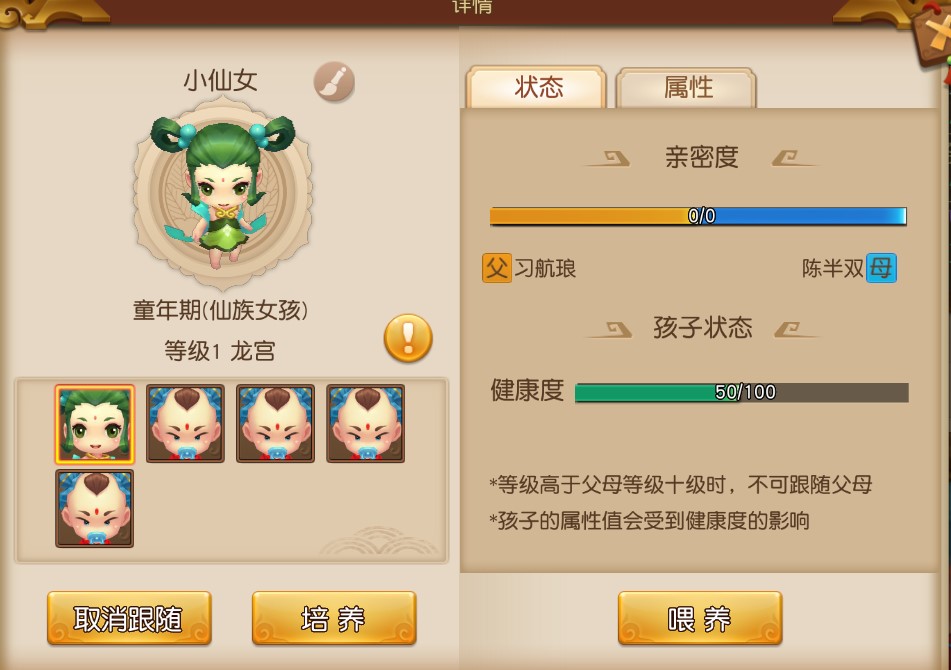 全新无双,炫斗升级!《梦幻西游无双2》现已开启全平台公测,作为《梦幻西游》无双版匠心续作,《梦幻西游无双2》战斗系统全新升级,在甜蜜浪漫的结婚系统基础上,同步开启养育系统,子女参战玩法将为无双炫斗体验带来更多新奇的感受和养成的欢乐! 夫妻结发,同心育儿 无双结婚系统开放以来,深受玩家欢迎,而养育系统的开放,更为玩家的三界体验翻开新的篇章。在《梦幻西游无双2》中结婚,恩爱值200以上,家园内有床,夫妻组队即可进行夫妻之礼。第二天,在佣人处延请郎中,诊断是否怀孕。怀孕成功,则进入胎儿期,胎儿的健康度每天都会累加到成长值中,当成长值满,房屋内会出现产婆,当生产进度满时,小婴儿就会降生三界陪伴父母。 资质培养,属性提升 孩子出生后即可以对孩子进行抚养,提升亲密度。当婴儿期成长度满时,孩子会进入幼年时期。幼儿期孩子通过兴趣学习能增加孩子的各项属性,包括体魄、力量、智力、筋骨、身法、审美、品行;这些属性直接对应到孩子的体力,物攻,法攻,防御,法防,命中和闪避的资质,学习次数积累的成长值满时,孩子会进入童年期。童年期孩子的初始资质由幼年期兴趣学习增加的属性点决定。 拜师学艺,并肩作战 进入童年期,支付一定的礼金后,孩子就可以拜师学艺!加入各大门派,学习战斗技能,同父母一起出战,成为父母PVP及PVE战斗中的强大助力! 拜师没有任何性别与种族限制,可以随意选择合适孩子的门派! 在孩子成功拜师后,将会拥有属于自己的专属武器。生成门派专属的主动技能与被动技能。同时,孩子也可以穿戴召唤兽装备,增加自己的力量。当玩家获得经验时,跟随的孩子会获得玩家所获得经验的一半。同时,还有专属道具,可以直接提升孩子的经验值,帮助孩子快速升级! 要注意的是,孩子只能高于自己级别10级,否则将无法跟随战斗。孩子的战斗属性会随着健康度而变化,当孩子的健康度低于80时,就无法发挥全部力量。健康度每小时会减少2点,使用喂养功能,可以帮助保持孩子健康!保持孩子的良好状态,才能够更好陪你并肩战斗,纵横无双三界! 了解更多相关信息,请前往http://www.yzz.cn/sy/mhws/ |