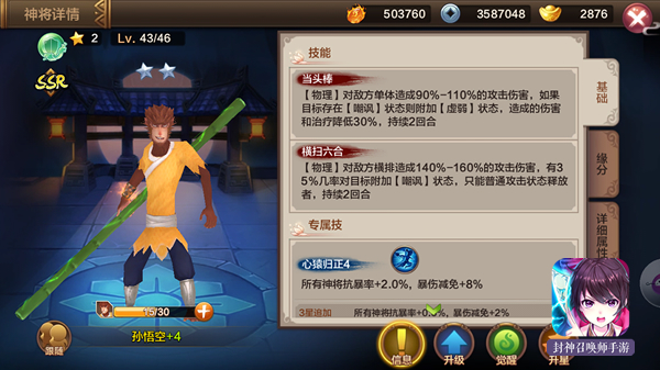 身披金甲,火眼金睛,一个跟头就是十万八千里!令妖魔闻风丧胆的齐天大圣孙悟空威风凛凛,一举穿越到《封神召唤师》的神话世界,成为神将为正道开路!《西游记之大圣归来》正版角色授权,SSR“齐天大圣”、SSR“孙悟空”以及SR“江流儿”前来助你一臂之力,神将技能将为召唤师们提供最得力的助力。 “双大圣”袭来 召唤神剑到身边 《封神召唤师》特地为威风凛凛的美猴王制作了“齐天大圣”以及“孙悟空”两款SSR神将,其中“齐天大圣”身披金甲圣衣,精神飒飒在沉寂后焕然一新,“孙悟空”则是还原了《西游记之大圣归来》中淡泊一切的布衣猴王。而江流儿本次是以SR神将的身份等待召唤师的召唤,江流儿可爱又坚韧,调皮的动作给召唤师留下极深的印象。 《封神召唤师》为玩家开辟了专门的召唤通道,玩家将有极大几率得到SSR齐天大圣以及SSR孙悟空,当玩家召唤次数超过20次,更将直接获得SSR孙悟空,为玩家队伍提供更加可观的助力!此外,SR江流儿等神将则可以在召唤界面中获得,召唤过程中玩家将更有机会得到SSR和SR等稀有神将,组成实力可观的队伍,与更加强力的妖邪作战! 神将技能解析 “大圣”神将必入手 SSR神将“齐天大圣”在游戏中被定为为“先锋”,普通攻击的状态下就能造成90%-110%的攻击伤害,更有35%几率对目标附加【晕眩】状态。当神将激活专属技,将增加所有神将暴击率与暴击伤害。齐天大圣的觉醒技则更加抢眼!上场将获得【涅槃】状态,受到致命伤害后不会死亡,驱散自身一切减益状态,并回复100%最大生命。 SSR神将“齐天大圣”技能一览 定位:先锋 缘分法宝——如意金箍棒 【普通技能】 奋起千钧:【物理】对目标造成90%-110%的攻击伤害,有35%几率对目标附加【晕眩】状态,无法行动,持续1回合。 【怒气技能】 踏碎灵霄:【物理】对敌方直线造成210%-230%,有35%几率连击,最多攻击3次,有35%几率使自己伤害提高20%,持续1回合,最多可以叠加3次。 【专属技】 大闹天宫:增加所有神将暴击率与暴击伤害 【觉醒技】 齐天大圣 上场获得【涅槃】状态,受到致命伤害后不会死亡,驱散自身一切减益状态,并回复100%最大生命。 攻击1 攻击+500 暴击1 暴击率+15% 英勇1 伤害加成+15% 抵抗1 伤害减免+15% 神性2 怒气技能的攻击效果提高15% 火眼金睛 被格挡时提高自身50%破击率,被闪避时提高自身50%命中率,效果持续两回合。 SSR神将“孙悟空”则侧重于“护卫”作用,战斗技能有几率让对手陷入虚弱或嘲讽状态,从而拯救己方于危险中。觉醒技能状态下,当神将被攻击且拥有【嘲讽】状态,则回复本次伤害的生命。 SSR神将“孙悟空”技能一览 定位:护卫 缘分法宝——如意金箍棒 【普通技能】 当头棒:【物理】对敌方单体造成90%-110%的攻击伤害,如果目标存在【嘲讽】状态则附加【虚弱】状态,造成的伤害和治疗降低30%,持续2回合。 【怒气技能】 横扫六合:【物理】对敌方横排造成140%-160%的攻击伤害,有35%几率对目标附加【嘲讽】状态,只能普通攻击状态释放者,持续2回合。 【专属技】 心猿归正 增加所有神将抗暴率以及爆伤减免。 【觉醒技】 美猴王 被攻击时,如果攻击者拥有【嘲讽】状态,则回复本次伤害的生命。 生命1 生命+5000 抗暴1 抗暴率+15% 英勇1 伤害加成+15% 抵抗1 伤害减免+15% 神性2 怒气技能的攻击效果提高15% 格挡2 格挡率+20% : SR神将“江流儿”的技能则非常还原僧人善良的特色,怒气技能“波若心经”将为队友回复可观的血量。作为药师型神将,江流儿的觉醒技能可以直接降低队友在战斗中受到的伤害,为战斗队伍的平安保驾护航。 SR神将“江流儿”技能一览 定位:药师 缘分法宝——大圣布偶 【普通技能】 头槌:对敌方怒气最高的单位造成80%-100%攻击伤害,为友方血量最低的1个目标回复50%攻击的生命。 【怒气技能】 般若心经:为生命最低的3个友方回复130%-150%攻击生命,友方目标生命低于50%时额外回复60%攻击生命。 【专属技】 七佛随身 增加仙人试炼SSR神将的基础掉落概率 【觉醒技】 唯识无境:怒气技能为己方全体附加【唯识无境】状态,受到伤害降低12%,持续1回合。 生命 + 3000 闪避率 + 15% 伤害加成 + 15% 伤害减免 + 15% 怒气技能的攻击效果提高15% 喋喋不休:被攻击时随机为1个友方怒气最少的目标回复35怒气,每回合最多触发2次 关于《封神召唤师》 国风二次元手游《封神召唤师》,为玩家带来三维无缝全景大世界下的热血战斗!《封神召唤师》取材于经典神话题材“封神演义”,并融入东方传统文化中的“符咒”概念,玩家可以自由设定咒文,瞬时召唤名耀古今的封神神将,亲手布局战斗,主导神将进攻。神将的性格魅力随设定而异,与玩家的羁绊将和跌宕起伏的剧情密切相关。游戏与最强国漫《狐妖小红娘》达成强强联动,超人气主角“涂山苏苏”穿越而来展开妙趣横生的冒险。超大主城畅行无阻,24小时跨服语音畅聊等必玩特色,带你率先进击全景联动的手游时代! 了解更多相关信息,请前往http://sy.yzz.cn/ku/fszhs/ |