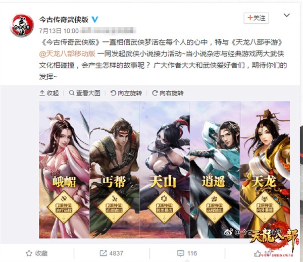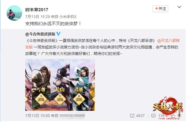 我们就是江湖!十年经典,金庸正版授权手游《天龙八部手游》现已龙腾公测,并于近日牵手《今古传奇武侠版》杂志,一同发起了武侠小说接力活动。当经典游戏与小说杂志两大武侠文化相碰撞、强联合,会叙写出怎的故事呢?为天龙故事接力,在《天龙八部手游》一系列大动作下,重新带起了国内的武侠故事的热潮。 为天龙故事接力 武侠小说接力活动开启 当《天龙八部手游》遇到了《今古传奇武侠版》,会发生怎样的“邂逅”?一个标新立异的故事接力活动就是两者的“爱情结晶”,经典游戏与小说杂志两个武侠文化携手一同发起了武侠小说接力活动,为天龙故事接力! 惊现多位知名武侠作家!活动参与火爆 在活动对应的微博下面,大家已经迫不及待的开始了故事接力,更有多位知名的武侠作家加入到活动当中。包括武侠奇才时未寒,大陆新武侠公认的武侠天才小椴,很多人是因为他才认识并喜欢上大陆新一代武侠的。其代表作有《乱世英雄传》和《长安古意》《开唐》等,在他续上的故事片段中,段天龙偶然在军营中撞见了鬼鬼祟祟之人,并与之交手。此外还有如亲切的刀子、侠说八道、王泡小泡、管平潮、楚惜刀、王晴川1228、万小刀、春十三香、木剑客、君天、真正碎石、春水无觞、踏歌行-玄武纪、竹喻枫等,均有在这场声势浩大的天龙故事接力活动中书写上精彩的一笔。 游戏跨界强强联手 带动国内的武侠热潮 跨界合作,在当今游戏圈内并不少见,但直接牵手传统期刊展开强强联手的案例实属首个。能够促成《天龙八部手游》与《今古传奇武侠版》的“联姻”,其根源在于二者的同根同源,同样是推崇武侠文化,植根于武侠世界。作为十年经典金庸正版授权手游,《天龙八部手游》重现了金庸笔下最宏大的天龙江湖,游戏还原经典端游玩法,并以原著小说构建起了游戏世界观和基础设定。《今古传奇武侠版》同样是主打武侠文化,是武侠类期刊,给予了网络武侠写手一个原创阵地。两者的强强联手,共同带动起了国内的武侠热潮。 探寻身世的神秘少年郎又会有什么样的江湖奇遇,最终他能否得偿所愿?整个故事的结局无从知晓,每一个人都可以提笔在故事中续写一笔,《天龙八部手游》携手《今古传奇武侠版》共同推出的武侠小说接力活动正在如火如荼进行中,等你来为天龙故事接力。 关于《天龙八部手游》 金庸正版授权,《天龙八部》端游原班人马倾心打造,完美传承端游核心特色与经典玩法。游戏以Unity5引擎打造真实3D视觉盛宴,再现聚贤庄、珍珑棋局、琅嬛福地等知名场景,更有乔峰段誉王语嫣等英雄角色指点传世神功,四大经典门派,远攻近战、刺客治疗各具特色,珍兽神器、装备打造、自由交易玩法丰富,还有行酒令、运镖、凤凰古城等快意帮派玩法,营造出一个荡气回肠、快意恩仇的热血武侠世界,完美呈现金庸笔下最宏大的天龙江湖! 了解更多相关信息,请前往http://sy.yzz.cn/ku/tlbbsy/ |