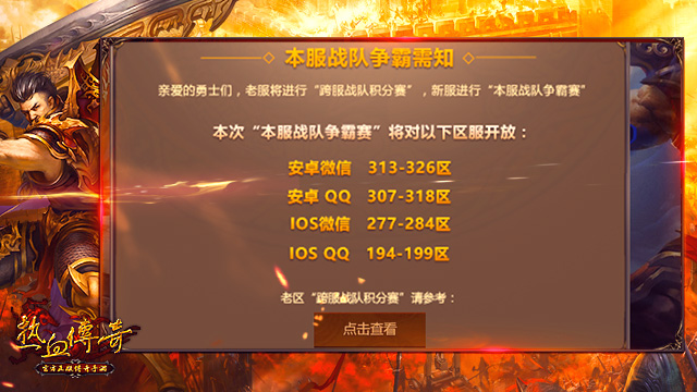 暑期狂欢,七月爽到底!《热血传奇手机版》3V3战队赛于7月24日双线进行,老服将开展“跨服3V3战队积分赛”的对决,而新服则是展开“本服3V3战队争霸赛”。各位勇士们!一言不合不如来场“3V3争霸赛”的激情对决吧! 第18届本服3V3战队争霸赛情况需知 本次“3V3战队争霸赛”在7月22日0点开启近3日的赛前备战阶段,截止到7月24日20点结束。而7月24日20点30分则将正式开启比赛,并在接下来的每周一、三、五(7月24日、7月26日、7月28日、7月31日、8月2日、8月4日)决出8强队伍,最后在8月7日、8月9日及8月11日的淘汰赛中诞生最终的冠军得主。 第18届本服3V3战队争霸赛的奖励仍然丰厚无比,冠军战队可以获得3个冠军腰带碎片以及“勇冠天下”的称号,冠军队长能获得【白银特戒宝箱】*3;而冠军队员则能获得【龙涎醉】*、3【绑定赤金矿石】*30,【绑定奇异酒曲】*10等等。冠军之后的亚军、八强奖励稍比冠军奖励逊色,但也都是秀色可餐,各位勇士们奔着奖励而战吧! 本次“3V3战队争霸赛”将对以下区服开放: 第4届跨服3V3战队积分赛情况需知 本次“3V3战队积分赛”同样定于7月24日正式开启比赛。在7月24日、7月26日、7月28日、7月31日、8月2日、8月4日、8月7日、8月9日、8月11日中午14:30-15:30和晚上20:30-21:30展开积分定级赛、在积分赛结束后,排名前80支战队根据积分进行段位评定,评定出段位的战队将有资格参加后半赛季相应段位的淘汰赛。淘汰赛分别在8月14日、8月16日及8月18日举行,期待霸主的降临吧! 第4届跨服3V3战队积分赛在奖励设置上同样不会另玩家们失望。冠军战队可以获得3个冠军头盔碎片以及“勇者之王”称号宝箱,冠军队长能获得【白银特戒宝箱】*3;而冠军队员则能获得【龙涎醉】*3、【熔炼精华包】*30等等。另外每一阶的5-8名都能收获单场参与奖:金币*10000,绑定声望令*2,勇者令*3,绑定鉴定符*3;以及积分奖励:金币*100000,绑定声望令*15,绑定功勋令*15,绑定祝福油*8。如此海量奖励就等各位大家蓄势待发,凭实力获取! 本次“3V3战队积分赛”将对以下区服开放: 此次3V3战队赛,本服与跨服的双线进行,每位玩家只能参与其中一种。但无论是参与哪一种比赛,都让我们摩拳擦掌,激情对战。2017年7月24日,全新赛季荣耀启航,赶快报名参赛,开启一代霸者之路! 了解更多相关信息,请前往http://sy.yzz.cn/ku/rxcqsjb/ |