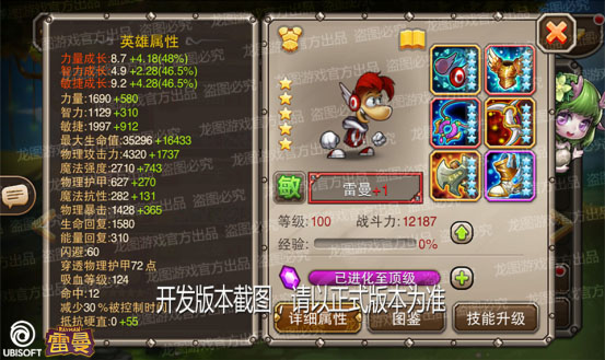 7月,育碧授权英雄再临,灵巧的雷曼将在传奇大陆上留下光辉的足迹! 传奇大陆一年一度的全明星长跑节正式开幕。英雄们都在努力奔跑,小冰冰离终点还有2公里时,心想今年要创纪录了!就在这时,后方传来惊呼声,一位陌生的参赛者,奔跑姿势铿锵有力,直接用跳跃的方式过人,这神级表现令众人折服。小冰冰还没反应过来,他已在终点处摆出了超帅的POSE!面对这匹突然杀出的黑马,众人瞠目结舌,只见大屏幕显示:“1st 雷曼”。 【属性介绍】 95级博学院,100级红1满装满附魔属性 作为前排物理系英雄,力量和敏捷属性卓越,物理攻击力和物理暴击在同类英雄中相当出众,穿透物理护甲属性让他的输出更上一层楼。优秀的生命回复和吸血能力使他在战场上更持久地翻江倒海。配合高闪避和减控属性的支持,雷曼在场上更加来去自如,活蹦乱跳的他既能帮助队友缩短控制效果持续时间,又能在敌人阵中拳打脚踢,施放各种控制技能,不停地骚扰敌方的进攻节奏。雷曼灵巧的身影即将遍布传奇大陆的各个角落。 此外,雷曼享受以下加成: 1.丛林系——享受仙女龙觉醒技能加成,可获得生命值上限提升 【技能介绍】 蓝色拳套(大招):雷曼获得蓝色拳套的力量,在普通攻击及蓄力飞拳时,拳套会协同攻击。再次释放还会强化为红色拳套,威力更强并附带灼烧效果。 蓄力飞拳(普通):雷曼通过蓄力打出更远更强力的一击并击退敌人(蓄力期间免疫控制效果)。 小心脚下(普通):雷曼在敌人头顶多次跳跃,造成伤害及短暂眩晕,最后落地时对周围敌人造成伤害并击飞。跳跃次数越多,落地伤害越高。 心之力(普通):雷曼小心脚下技能施展多次后,会获得一颗心(每场战斗中有获取次数限制)。免疫下一次受到的致命伤害,恢复部分生命并无敌一小段时间。 蓝色拳套: 雷曼获得蓝色拳套的力量,在普通攻击及蓄力飞拳时,拳套会协同攻击; 再次释放还会强化为红色拳套,威力更强并附带灼烧效果。 蓄力飞拳: 雷曼通过蓄力打出更远更强力的一击并击退敌人; 蓄力期间免疫控制效果。 小心脚下: 雷曼在敌人头顶多次跳跃,造成伤害及短暂眩晕; 最后落地时对周围敌人造成伤害并击飞; 跳跃次数越多,落地伤害越高。 心之力: 雷曼小心脚下技能施展多次后,会获得一颗心; 心在每场战斗中有获取次数限制; 免疫下一次受到的致命伤害,恢复部分生命并无敌一小段时间。 【站位介绍】 作为前排物理系输出,雷曼站位位于前排偏后的位置。开场时,雷曼可以在前排强力坦克的防护下,尽可能减轻敌方首轮攻击&控制技能的干扰,舒适地打出自己的第一发击退重拳。随后雷曼将在敌阵中来回跳跃,影响敌方技能的正常施放,并用强悍的拳脚凶狠地教训敌人。雷曼多次跳跃后将获得一颗心,它能为雷曼抵御一次致命伤害,并获得短暂的无敌时间和部分生命值的回复,这一强力的自保技能为雷曼肆无忌惮的进攻增加保障。此外,雷曼通过鼓舞士气,为队友减少控制时间,使团队的进攻更加流畅。灵活的雷曼即将搅乱队长大大们的排兵布阵,面对他的强势骚扰,你准备好了吗? ★★出世即觉醒★★ 雷曼长年累月磨炼自己的拳脚从而获得觉醒能力! 队长大大们只要将他培养到90级橙,即可开启他的觉醒之旅咯~~ 觉醒图: 觉醒技能: 鼓舞:雷曼的技能会影响到其范围内的友方单位,减少眩晕、沉默、缴械、定身及恐惧效果的持续时间。 觉醒装备: 雷曼觉醒装备——飞羽耳麦,敏捷的提升使雷曼的拳脚更加犀利,生命值和物理护甲的提升让雷曼可以更持久地在战场上大显身手。 觉醒之旅: 觉醒之旅第一站:队长大大们可以在第17章精英副本-神明遗迹中收集雷曼的觉醒材料; 觉醒之旅第二站:雷曼参与完成任意预言之池难度5或以上,2次; 觉醒之旅第三站:雷曼参与完成精英关卡:第14章-龙语,且无人阵亡,1次。 【小剧透】 1.乱拳出击——雷曼的拳法相当了得。蓄力飞拳直接将敌方击退并造成沉重的伤害,跳跃到敌阵中后时而勾拳、时而直拳更是让对手眼花缭乱,难于招架。大招状态下,拳套变为蓝色,拳术变得更加精湛,第二次施放大招时,拳套升级为红色,炽热的拳法将更无情地折磨对手。 2.满场骚扰——雷曼矫健的步伐令人难以捉摸。雷曼的小心脚下技能,在敌人头顶蹦了蹦去,把敌人耍的团团转,最后一跃更是造成可观的范围伤害,并砸散敌方阵型。可不要认为雷曼这么跳是在立死亡Flag,施展多次小心脚下技能后,雷曼将获得免死心的护佑,抵御一次致死伤害,延续自己的战斗力。 3.减控能手——雷曼觉醒后将为队友提供振奋人心的精神鼓舞,在雷曼技能覆盖范围内或施放路径上有友方单位,则队友会获得一定的减控增益,这将使己方的进攻节奏更加流畅,增加己方团队整体输出能力,雷曼对整个团队的作用也不容小觑啊! 了解更多相关信息,请前往http://sy.yzz.cn/xbbcq/ |