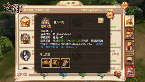 《九阴》手游2周年资料片“武道家缘”上线后,一大波福利也随之而来,相信各位侠客这次一定赚的盆满钵满。今天,小九要根据这次新版本的改动,为大家推荐一个每日必做任务指南。万事皆知的老司机和完全不在乎的神壕可以继续去玩耍了,还在江湖里打拼的游侠们不如来讨论一下。 必做任务之:心魔 在这次更新中,心魔玩法可以获得开光材料了!对于普通玩家来说,给装备开光是非常不容易的事,就算是称霸一方的大佬,也并非全身装备都能满级开光,这只有称霸全服的神壕才能做到。心魔玩法加入开光材料后,当然是各位侠客每日必做任务,天赐良机,不容错过! 重要指数:★★★★☆ 必做任务之:塞外大漠 坐骑增加了驯化功能,塞外大漠任务也随之火了起来。完成塞外大漠任务可以获得升级坐骑必须的粮草和马鞍,在塞外大漠兑换商店还能换取坐骑驯养材料和冷龙驹。想要坐骑跑得更快,每天就去找江洋大盗的麻烦吧! 重要指数:★★★★ 必做任务之:跨服大世界 不得不说,跨服大世界绝对是收益最高的任务了,相信每位侠客都知道跨服大世界有多重要。在跨服大世界中击杀BOSS,玩家可以获得极品武学残卷,鹰饲料等诸多珍稀物品。本次新资料片中,跨服大世界玩法还增加了小怪经验和坐骑驯养材料! 重要指数:★★★★★ 必做任务之:多人禁地 无论如何,多人副本还是要打的,除了必要的武学残卷,新版本中多人禁地玩法还增加了粮草的奖励数量。从多个玩法加入坐骑驯养材料来看,周年庆最开心的并不是玩家,而是你们胯下的神驹! 重要指数:★★★☆ 必做任务之:江湖试炼 内力升级,装备强化,干啥不需要碎银?所以最基础的江湖试炼还是老老实实完成吧。就算是武艺高强的豪侠,也有囊中羞涩的一天,不如每日伸展一下拳脚,赚够了银子再去江湖潇洒也不迟。 重要指数:★★★ 九阴江湖风起云涌,八方名仕齐聚中原!又到了扬名立万的好时候,相信各位侠客对于新版本还有属于自己的独到见解,不如拿出来和大家交流分享。 了解更多相关信息,请前往http://sy.yzz.cn/ku/jysy/ |
