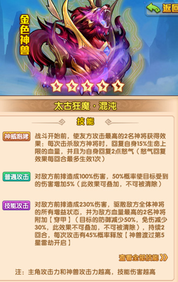 太初凶神登临,神威咆哮灭世。西游卡牌王者之作《少年西游记》新资料片“大闹天宫”现已上线,首只金色神兽“太古狂魔·混沌”登录三界,带来特色强力技能“神威咆哮”和“吞噬”养成玩法。 新资料片“大闹天宫”现已上线 灭世凶神 太古狂魔混沌 “太古狂魔·混沌”原画预览 天地之初,洪荒巨兽横行,相传在西天界有尊绝世凶神混沌,曾屠神十万以证大道,是三大灭世凶神之一。 首开神威咆哮 开战前增加神将天赋 “太古狂魔·混沌”技能预览 新的金色神兽“太古狂魔·混沌”首开了特色技能“神威咆哮”,可在对战开启时,为指定神将增加特殊天赋,使已方神将在击杀敌方时,大量恢复气血和怒气,进一步加快已方的输出节奏。 清除增益状态 限制敌方主力 特色“吞噬”养成玩法 除了可以在战斗前为神将增加天赋,金色神兽“太古狂魔·混沌”还可在对战时,对敌方前排神将造成高额伤害,并清除敌军全体的增益状态,同时还能对敌军主力神将造成破甲效果,该大招的双重特效将对敌方主力神将造成重挫。 此外,新的金色神兽还开启了“吞噬”玩法,通过吞噬红色神兽碎片来进一步提升属性,该玩法颠覆了以往的神兽养成方式。 点亮图鉴 百分比增强属性 图鉴“太古焚天”效果预览 全新的金色神兽“太古狂魔·混沌”不仅战场上表现强势,收集后还可和之后推出的金色神兽组成图鉴“太古焚天”,提升阵容20%的伤害和免伤,极大增强玩家战力。 为庆贺资料片“大闹天宫”上线,《少年西游记》开启了长达一个月的福利狂欢月活动,玩家登陆游戏即可领取绝版称号、红色神兽碎片等价值超过十万元宝的奖励,更多资讯,请关注官方后续公告。 了解更多相关信息,请前往http://sy.yzz.cn/ku/snxyj/ |