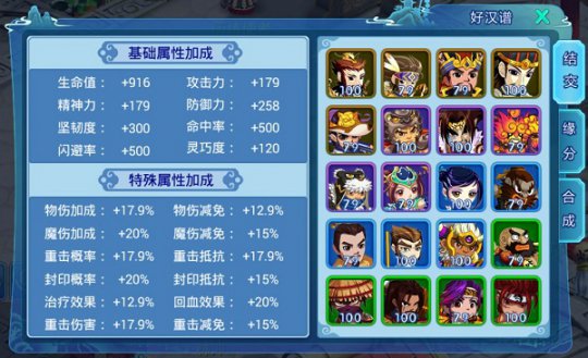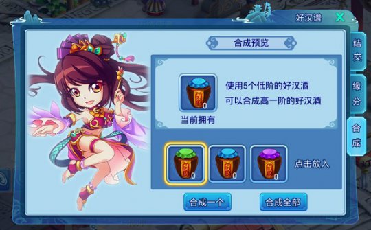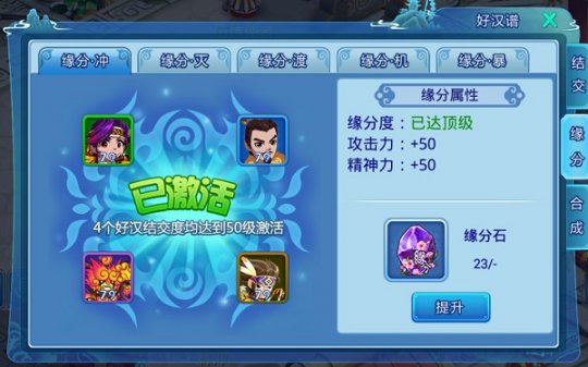 本周更新中,回合必玩典藏手游《水浒Q传》手游推出全新玩法“好汉谱”。众所周知水泊梁山的好汉好酒,在这个玩法中,只要给对应的好汉赠与好酒,和他们畅饮几杯,就能提高跟他们的结交度,从而提升自身的属性加成。 【赠与好酒 属性暴增】 目前共推出20个好汉,他们分别对应20攻击力、生命值、重击伤害等20项不同的属性,从上表可以看到,把20个好汉结交一轮后,人物整体属性将提高20%,基本是不可错过的玩法。 与好汉结交难免要酒,好汉酒一共分为橙、紫、蓝、绿四类,其中橙色和紫色可以通过通关天罡副本获得,蓝色和绿色则藏在地煞副本中。 【激活缘分 二度提升】 虽然梁山好汉全都是兄弟,但总有某几个经常一同出生入死,缘分非凡。在好汉谱玩法中,特定好汉在结交度均50以上时,通过缘分石激活,能产生额外的加成效果。 以上图为例,顾大嫂、柴进、神火将和花荣的结交度均50以上了,所以消耗缘分石后,能额外获得攻击力和精神力的加成。好汉缘分玩法中,一个有5个缘分,每个缘分可以升级,需要消耗不少的缘分石。目前缘分石只在天罡地煞副本中产出,所以水粉们要积极通关天罡地煞副本哦! 【好酒兑换 可别浪费】 另外,酒的品质按照绿蓝紫橙一次提升,每5个低阶的好汉酒可以合成一坛高一阶的好汉酒,如果有多余的低阶好汉酒可别扔了。 必须强调的是,无论是提升结交度还是激活缘分,所提升的属性都是主角,而不是星将,所以水粉们别误会了哦! 了解更多相关信息,请前往http://sy.yzz.cn/shuihuqchuan/ |