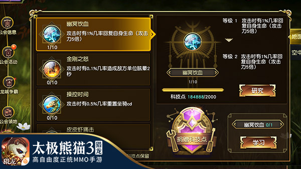 自由狩猎肆意空战的猎龙玩法,惊险刺激充满挑战的副本战斗,还有广袤无垠自由开放的大世界探险,蜗牛旗舰MMO手游大作《太极熊猫3:猎龙》为你带来截然不同的MMO手游体验。《太极熊猫3:猎龙》预计将在9月28日迎来全新资料片更新!为了让玩家在广阔的大世界地图中找到更多的乐趣,“夜刃降临”新资料片中加入了大量大世界玩法,难以抵挡的冒险之旅即将开启! 【藏宝图玩法,谁能成为夺宝奇兵!】 在伊瓦兰斯的古老土地上有着许多被人遗忘的宝藏,只要谁能找到,就能获得意想不到的财富。《太极熊猫3:猎龙》新资料片中,藏宝图玩法将带领玩家收集残破的碎片,合成记载着秘宝的藏宝图,只要循着藏宝图的指示,无尽的宝物只等你来获取! 玩家在玩法中能够获取异闻录和神传集两种珍贵的藏宝图,每种都能为玩家带来惊人的收获,金币珠宝、修炼秘籍,还有奇珍异兽等你来驯服!而神传集更是有着能够召唤强大世界BOSS的传闻,只要足够强运,通过藏宝图玩法获取到广大玩家梦寐以求的世界BOSS坐骑也不足为奇! 【占地为王,热血厮杀为公会而战!】 除了考验个人能力的藏宝图,《太极熊猫3:猎龙》新资料片中还加入了团队合作,据点争夺的占地为王玩法。大世界地图中将会出现大量野外据点,这些据点有着丰富的物资,但野外的魔物伙同强大的领主守护着他们的领地,想要独吞宝贝可不是件容易的事情。 但如果能够集结公会成员,征服领主,整个公会就能够得到这片土地的掌控权,不仅可以获得领地内丰富的资源,还能让据点领主协助防守,为公会全体带来无可估量的收益。征服据点称霸一方的时代正式来临!你准备好成为最强公会了么! 【公会科技!强势助力伴你纵横天下!】 为了让玩家更好的在大世界中冒险,新资料片中新增公会科技树系统,玩家只需要通过贡献相应的材料,就可以为公会科技树进行升级,通过研究发展陆地科技和空中科技两类神奇的增益效果! 这些通过研究坐骑伙伴而带来的神奇能力能够为大世界冒险带来前所未有的帮助,强化你的战斗力,提高你的生存能力,甚至还能再危急时刻提供控制和庇护能力。想要纵横伊瓦兰斯,打遍天下无敌手?那你绝不能错过发展公会科技! 太极熊猫3:猎龙》全新资料片即将上线!全新刺客职业亮相,灵活飘逸的暗杀大师将带你勇闯巅峰,赶快前往下载,开启你的猎龙冒险之旅! 关于《太极熊猫3:猎龙》 《太极熊猫3:猎龙》在游戏玩法和游戏体量上尝试全新的突破。多项尖端技术倾力打造极尽真实的自由探索大世界,自由狩猎、立体化战斗,爽快打击感带来最佳游戏体验,引爆PK新潮流! 了解更多相关信息,请前往http://sy.yzz.cn/ku/tjxm2/ |