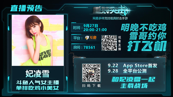 网易多样竞技载具射击手游《重装突击》将在9月28日开启全平台公测,从今天上午10点起,玩家就能进入官网(http://zztj.163.com/)预先下载安卓版游戏客户端,抢先一步备战。而在今晚,斗鱼人气主播妃凌雪也将进行《重装突击》竞技直播,想和雪哥一起约战?今晚8点直播不容错过!
