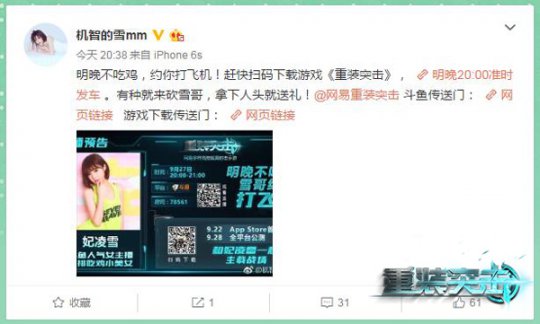 在今晚的直播中,妃凌雪将邀请玩家进行混战、突突大作战等竞技玩法对决,作为“吃鸡”主播,首次尝试载具射击游戏,会产生怎样的对战效果?让人期待。而雪哥也在昨天发出微博邀请玩家进入游戏和她同场竞技,能拿雪哥的人头,就送礼!能“吃鸡”同样也能突击,雪哥可是自信满满!
