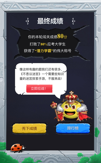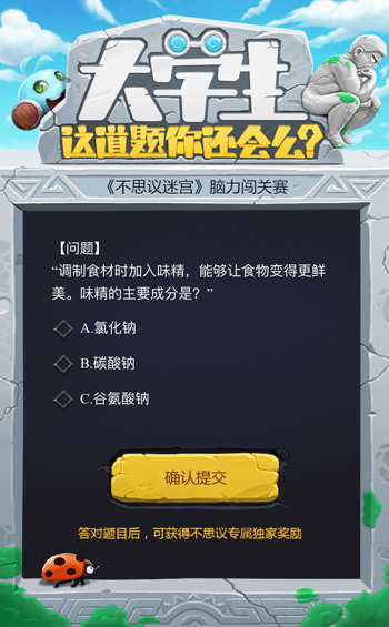 享受完轻松愉悦的国庆假期,重返校园的同学们有发现你的食堂大变样了吗?10月10日,《不思议迷宫》中烧脑的迷宫彩蛋被花心思玩出了新花样,成为了独特的餐桌知识谜题在全国高校推出,同学们只需扫描餐桌上的二维码,即可进入线上页面,开始线上闯关答题,并可在页面中输入答案领取礼物。各位小伙伴,带上你的好奇心,快来参与这次知识挑战吧! 猎奇迷宫彩蛋,挑战你的脑回路 在《不思议迷宫》中,玩家不仅可以在迷宫探索中发掘各种隐藏资源,还有各种让人绞尽脑汁的解密元素与无处不在的惊喜彩蛋等你发现,卡纳斯著名男巫薛定谔提出的“死掉的猫”的理想实验,古老保险箱上需要破解的达芬奇密码,魔法少年冈布奥提出的生男孩概率恶搞彩蛋......解决这些搞笑的冷知识彩蛋就如同经历一场刺激的脑力挑战,拒绝无脑点击。 这不是一个普通餐桌,而是趣味谜题考验 《不思议迷宫》此次设置的餐桌谜题,为同学们的吃饭时间带来新鲜的体验,饭桌上的每个谜题都需要动动脑来解决,想要回答正确不是一件简单的事,10道涉及不同领域的谜题让你虐出新意,你有可能一脸黑人问号,你也可能会寻求你的朋友求助,这次知识冒险并不轻松。 游戏玩得溜,知识量多才够 想要《不思议迷宫》玩得溜,其中所需要的知识量涉及广泛,艺术、电影、数学......在本次的餐桌烧脑中也有所体现, 不仅需要你在餐桌谜题中解答数列题;需要了解化学知识中的光合作用与水解反应;甚至需要了解味精的成分,你可能还需要重温高中课本,复习数理化知识。 参与者只需扫二维码即可参与本次挑战,同时活动H5还会判定每个同学的答题时间与正确数量核算出总成绩,最后还会出现记录个人排名和学校排名的排行榜,这是一场高校之间没有硝烟的“脑力角逐”,赶快来参与吧! 关于《不思议迷宫》 《不思议迷宫》以Roguelike类游戏玩法为核心,通过翻开地砖遭遇各种随机事件及怪物的形式来探索迷宫深处。数十个玩法各异的地图副本,近百只特色冈布奥收集,上百款迷宫彩蛋待你挖掘,上千种组合搭配等你探险!操作简单,好玩到肝爆!且看小怪物“冈布奥”如何战胜大怪物拯救世界! 了解更多相关信息,请前往http://sy.yzz.cn/ku/bsymg/ |
