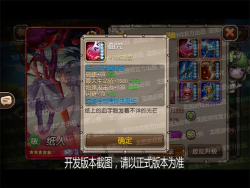 在滩头古镇举办的剪纸比赛中,小冰冰在比赛中获得第一名奖励,获得一把剪刀,从此,小冰冰迷恋上剪纸,并想制作一个纸人,陪自己玩耍。 在剪纸过程中不小心视线模糊了一刹那,剪刀刺破了手,一滴血珠浸入到纸人中。 待到夜深人静的时候,寒冷的夜风不小心吹掉了屋内的油灯,火慢慢烧起来,然而纸人突然动了起来,小冰冰从睡梦中惊醒,发现纸人在奋力保护着她,只见纸人召唤出巨型剪刀,切裂地面,控制住火势。小冰冰万万没想到,自己一点点兴趣最终拯救了她。 10月,魂匣纸人被手艺人唤醒,她将挥动剪刀剪断战场上的来犯者! 【属性介绍】 95级博学院,100级红1满装满附魔属性 作为中排输出类英雄,敏捷属性非常出众,优秀的物理攻击力、物理暴击和穿透使她的剪刀更具致命一击的威胁,其高生命值和闪避保证战场的生存能力。转移伤害、制造眩晕并给敌方制造出混乱,为大剪刀的致命一击营造空间,释放大招后会让敌方付出沉重的代价。如此一位攻守兼备的英雄,队长大大们将如何搭配自己的强力阵容呢? 此外,纸人享受以下加成: 1.女性——享受军团觉醒技能加成,可获得生命值上限提升 2.女法神——享受黑暗先知觉醒技能加成,可获得法术穿透增强 【技能介绍】 一刀两段(大招):纸人将怨念化作的巨大剪刀召唤到场上,切裂地面,对全体敌人造成魔法伤害并减少他们的生命值上限,并在地面上造成无法跨过的裂痕。 怨念纸人(普通):纸人在敌方密集处召唤法阵生成一个怨念娃娃,娃娃生成时对敌人造成范围魔法伤害,召唤的纸人不会被选为目标,但是当纸人被攻击一定次数后,将会触发怨念波动,对范围敌人造成魔法伤害并且减少他们的生命值上限。 符文纸轮(普通):纸人向敌人投掷一堆纸轮,对敌人造成魔法伤害并眩晕,之后纸轮会缠着敌人对敌人造成持续的生命流失并减速,如果敌人不在晕眩状态,生命流失速度和减速程度都会大大加强。 散花(普通):当纸人受到超过最大生命值一定比例的伤害时,将会牺牲一部分身体将伤害限定在一定比例,反弹过量神圣伤害给攻击她的敌方单位,并转移位置到我方更密集的地方去。每场战斗有触发次数限定。 一刀两段 纸人将怨念化作的巨大剪刀召唤到场上,切裂地面。 对全体敌人造成魔法伤害并减少他们的生命值上限,并在地面上造成无法跨过的裂痕。 怨念纸人 纸人在敌方密集处召唤法阵生成一个怨念娃娃,娃娃生成时对敌人造成范围魔法伤害,召唤的纸人不会被选为目标。 当纸人被攻击一定次数后,将会触发怨念波动,对范围敌人造成魔法伤害并且减少他们的生命值上限。 符文纸轮 纸人向敌人投掷一堆纸轮,对敌人造成魔法伤害并眩晕。 纸轮会缠着敌人对敌人造成持续的生命流失并减速。 敌人不在晕眩状态,生命流失速度和减速程度都会大大加强。 散花 当纸人受到超过最大生命值一定比例的伤害时,将会牺牲一部分身体将伤害限定在一定比例。 反弹过量神圣伤害给攻击她的敌方单位,并转移位置到我方更密集的地方去。 每场战斗有触发次数限定。 【站位介绍】 作为中排输出,纸人站位位于中排偏后的位置,纸人在符文纸轮技能的加持下可以有效扰乱敌方的进攻,为我方争取宝贵的输出空间。如果前方有强力坦克保驾护航,她将在中排充分地做好大招准备。纸人的一刀两断极具威胁,不仅对敌人造成非常可观的伤害,还可以减少敌方的生命值上限,并对战斗场地进行有利己方的分割。警示之剪更是从开场就让敌方阵容中存在一个瘟神,这名敌人将头顶一把锋利的剪刀去战斗,真是鸭梨山大。纸人的剪刀毫不留情,不想被剪断身体就拿出搏命的心态与之抗衡吧! ★★出世即觉醒★★ 纸人剪断了头发,剪断了牵挂从而激发觉醒之力 队长大大们只要将她培养到90级橙,即可开启她的觉醒之旅咯~~ 觉醒图: 觉醒技能: 警示之剪:纸人在战斗开始时会获得一个永久强化:纸人的魔法暴击,物理攻击,魔法穿透增强,并召唤一把剪刀悬挂在随机的一名敌人头顶,当敌人消耗超过一定能量时,剪刀将会在延迟一会后落下,对该敌人造成大量神圣伤害。 觉醒装备: 纸人觉醒装备——血咒,物理攻击力和敏捷的增益进一步凸显她在场上造成致命伤害的威胁,生命和闪避提升让她的生存能力更有保障。 专属装备合成材料: 觉醒之旅: 觉醒之旅第一站:队长大大们可以选择第13章-第20章中的任意一个精英副本来收集纸人的觉醒材料; 觉醒之旅第二站:纸人参与完成精英关卡:第14章-山腰相逢,且亲自消灭小黑。 【小剧透】 1.致命一击——纸人作为中排输出英雄,大部分技能伤害都是受物理攻击力加成的魔法伤害。最擅长的是一招致使敌方残血或殒命,限制最大生命值的效果让敌方的治疗苦不堪言,对场地的重新划分将使阵型的推进更加扑朔迷离。这种扭转战局能力,会让敌方惊恐万分,纸人挥动剪刀必将引起战场的轩辕大波! 2.索命娃娃——不仅纸人的伤害技能可以提供可观的输出,纸人的怨念还将为敌人种下恶果。纸人召唤法阵生成一个怨念娃娃有很强的魔法伤害效果,当纸人被攻击一定次数后,怨念就会发动,敌人的生命值上限面临又一次减少,这是一个奶妈会哭的情节! 3.一纸多用——纸人同时具备控制能力和自保能力。符文纸轮会对敌人造成眩晕和减速效果,拖缓敌方进攻的节奏。散花技能能快速让自己脱离陷阱,到达有利的输出位置,
