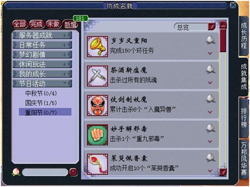 人生易老天难老,岁岁重阳,今又重阳,战地黄花分外香。重阳佳节,寓意深远,人们对此节历来有着特殊的感情,素有登高、踏秋、访老的传统。随着九月初九的到来,如往年一样,梦幻西游为大家带来了精彩的重阳节活动,这里第一时间就给大家带来一些活动的体验,一起来看看吧。 登高载酒插茱萸 凭栏御风赏秋意 秋意正浓,重阳节即将在10月26号正式开启,届时小伙伴们可以在线上体验到本次活动啦。 这次活动分为环式、小副本、单人副本、特色开香囊、秘境挂机、投放怪、口袋版活动。包含丰富的经验及物品奖励,五宝、树苗、修炼果等等,并且完成任务会获得相应的成就,成就党不容错过。 年年岁岁又重阳 梦幻今夕有惊喜 九九重阳节素有登高、踏秋、访老的传统,三界的百姓值此佳节之际纷纷外出登高赏菊、慰问老人。少侠也前去邀三五好友,共同出门看看这重阳佳节的热闹景象吧! 活动期间,玩家可以在长安城(230,120)重九老人处领取组队环任务,按照提示完成任务,就可以获得丰厚的经验、金钱、物品和积分奖励。每10个小任务为一轮,完成一轮后队员可以获得3个驱邪细绢,队长可以获得4个驱邪细绢,并且队伍成员均有一定概率获得山茱萸果。驱邪细绢和山茱萸果可以合成为茱萸香囊,打开后即可获得丰厚奖励! 队长每次成功带队完成一轮环任务时,均获得一次旋转队长奖励转盘的机会,有丰富的物品奖励! 梦幻口袋登群山 奇珍异宝任你拿 重阳佳节,秋高气爽!重九老人特地来到口袋幻境之中举办“重阳登高”活动。幻境之中有10座高山,登高成功即可获得奖励! 活动期间,选择主界面突发事件列表中的“重阳登高”图标即可参与活动。玩法界面地图中有10座高山,点击高山图标即可参与重阳登高活动。每登高一座山峰将消耗100点精力,每人每天有10次登高机会,每座山峰每天只能登高一次。在登高的过程中将有可能遭遇“赏菊”“饮酒”等意外事件,成功完成以后即可完成登高,并获得相应的奖励。 重九老人携百宝囊来到口袋幻境,各位玩家若是有缘即可获得“茱萸香囊”。据说香囊内藏各种惊喜哦! 重阳节这个节日发展至今,已经成为我们所喜闻乐见的一个节日,人们往往在这天聚在一起插茱萸、登群山等等,旨在亲友间互相祝福,轻松欢乐地度过这一天!你也不妨打开电脑,在《梦幻西游》电脑版里,和小伙伴们一起“登高望远、访亲问友”吧! |
