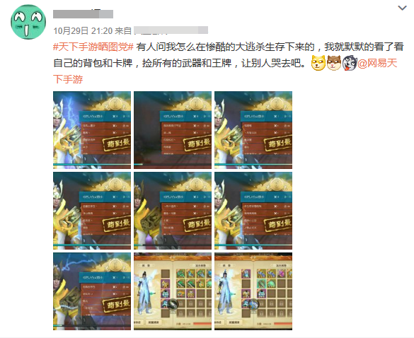 真3D极致画面,无缝大世界,网易顶级品质旗舰《天下》手游江南生还者直播周趣味来袭!女装大佬上演花式求生,解锁吃鸡新姿势,带你围观江南最强套路王!收获军饷福利,赢取专属好礼,哪位天下少年将成为最具潜力的游戏主播?参与微博话题,分享你的求生小故事,更有精美周边福利等你抱回家!拒绝落地成盒,争取每天吃鸡,江南生还者陪你一起约约约! 【求生故事说出来 精美周边带回家】 泳装清凉登场,装备全都靠抢!全新求生玩法“江南生还者”上线后,吸引了众多热爱吃鸡的天下少年。究竟是花式伪装苟到最后,还是化身变装大佬纵横战场?是否得益于作弊屋的神助攻,才最终实现远程降维打击?经过近半月的浴血奋战、斗智斗勇,想必各位少侠也摸索出不少吃鸡绝学了吧? 11月3日之前,参与官方微信、微博“求生故事分享会”,分享或吐槽少侠的求生经验,秀出少侠的吃鸡独门秘笈,就有机会获取精美周边礼物啦! 微信参与方式:带上求生经验,以及求生精彩瞬间或战绩截图,后台留言给官方公众账号“天下手游”即可。 微博参与方式:以#天下手游晒图党#为话题,分享求生经验,并带上求生精彩瞬间或战机截图发布到微博,同时@网易天下手游。(微信微博两种方式任选其一) 本次活动的周边奖励有:“乐正绫&洛天依人形亚克力立牌套装”,“冰心扇手机支扣”,以及呆萌可爱的“囧草精异形抱枕”!喜欢乐正绫和洛天依的少侠们,两位小姐姐终于可以一起抱回家咯! 江南生还惊险对决,命悬一线绝处逢生!少侠在这里经历了哪些有趣的故事?亲历厮杀后又有哪些独门求生秘籍?与天下少年一起分享你的吃鸡经历,软萌小姐姐、囧囧小草精统统等你来哦! 了解更多相关信息,请前往http://www.yzz.cn/sy/tx/ |