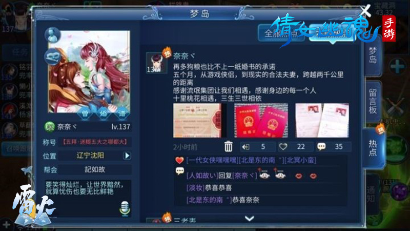自从倩女手游上线以来,得益于其强大的社交系统,无数少侠缘结三界、情定倩女。在游戏中就有着这样一对侠侣,他们的爱情故事让人惊叹。五个月的时间里,跨越五千公里的距离,从游戏中的伴侣奔现成为合法夫妻!而为他们俩牵线的居然是微信红包? 【红包牵起三生缘,倩女侠侣喜奔现!】 【折颜】与【奈奈】相识于帮会微信群,而因为《微微一笑很倾城》入坑倩女手游的二人一开始便有很多的共同语言,很快就互相熟识。两人之间的缘分可以说是上天注定,春节时群里玩抢红包游戏,只要折颜发红包,最佳手气就是奈奈;而奈奈发的时候,折颜也总是最佳。这样来来回回,发了不下三十个。而在这之后两人的关系也越来越热络。随着在游戏中的互相陪伴,爱情的种子也在他们心中慢慢生根发芽,这也促使了他们最终的线下见面。 【相知相识莫相忘,线下一见订终身!】 身处东北和安徽的两人首次线下见面是在天府之国成都,为了不让女方出钱买返程票,折颜还给奈奈买了去自己老家的机票。因为飞机规定,【折颜】不得已把准备的玫瑰扔了,这件事还让【奈奈】心疼了很久。 行动派的【折颜】一到成都便把奈奈领进了家门,还把父母吓了一大跳。【折颜】父母热情的态度,更让奈奈坚信这份感情是正确的。当她父母了解到这段情缘后,被两人之间的故事打动,一起再次拜访了【折颜】一家……而三个月后,两人便顺利结为了夫妻! 【求婚岂能如儿戏,三生三世永不离】 然而一直觉得欠了奈奈一个求婚的【折颜】,每周末都会消失一天,偷偷准备起了自己的求婚计划,而这却一不小心冷落了【奈奈】。而后趁着三生三世电影上映,【折颜】实施了自己的计划。当在电影结束后,【奈奈】惊喜的发现大屏幕上居然播放起了两人爱情历程的沙画时,心中的委屈全部消散,满眼都是幸福!而后,折颜手捧鲜花, 拿出特别定制的婚戒向【奈奈】求婚,说出了心中的那句话。 【膜拜再增新榜,新服如约开启】 本期膜拜榜新增才高八斗排行榜,玩家【不惧金戈】拔得头筹。同时其他榜单的争夺也是热度不减,称霸三界排行榜中【凌霄ゞ太清】以1519071战力位居榜首,而第二名【无心ぃ法师】以1518293的战力紧随其后。本期的壕无人性榜中,【^哥哥必须帅^】送出了5727536700的银两,当之无愧地夺得了第一!其他更多精彩排行,详情尽在本期膜拜榜。 同时今日互通大区【古今情】新服【曲江池】也如约开启,更有葫芦娃玩法全面上线,邀三界侠客鏖战如意洞,智勇斗蛇精! 新一代国民手游《倩女幽魂》是《新倩女幽魂》端游的官方手游,拥有端游级唯美画风与人设,传承经典玩法,男神杨洋倾力推荐!马匹系统,现已开启,葫芦娃蛇精等BOSS已全面入侵,你准备好了么? |