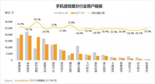棋牌游戏市场越来越热闹,但繁花似锦的背后却也瓶颈若现——用户的增速正在放缓。据QuestMobile《移动互联网2017年Q3秋季报告》(下文简称《报告》)显示,9月份手机棋牌游戏用户已达2亿规模,比去年同期增长了14.9%,增速下滑至两位数边缘。