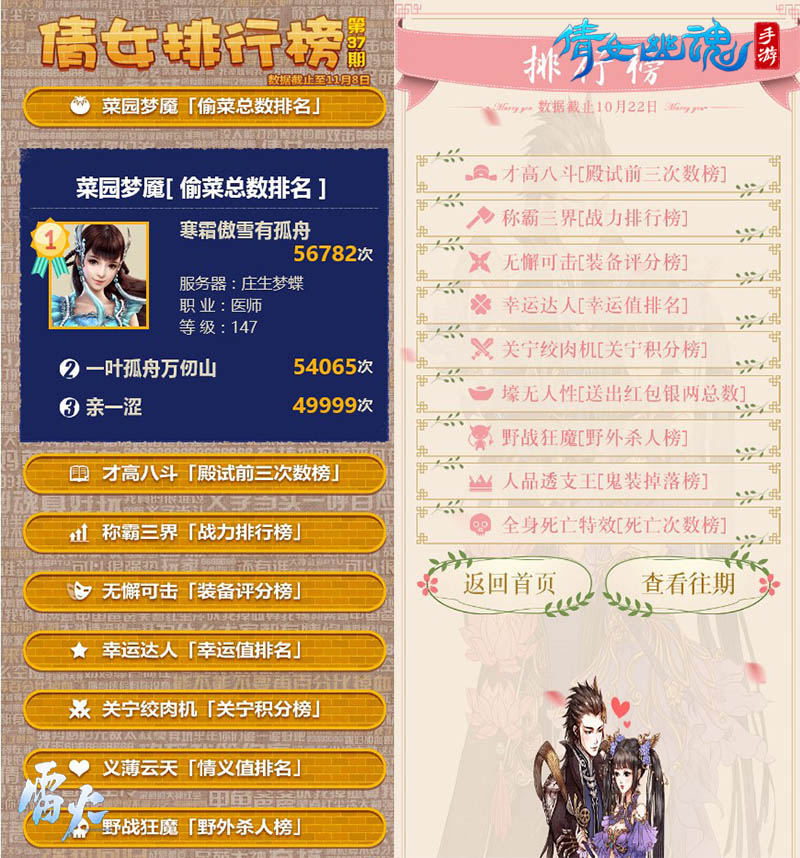倩女手游膜拜榜37期 大神告诉你无敌是多么的寂寞 倩女手游三界中不少侠侣的美满情缘,让人羡慕不已。最近就有这样一对大神夫妇,不仅给各位少侠喂狗粮,实力也堪称顶尖级别。弃坑半年后强势回归建立帮会,竟然能一呼百应,让各方大佬都紧随其后?本期膜拜榜就带你探秘这对大神夫妇,感受他们的别样魅力。 【回归游戏,义字当头重建帮会!】 【笑看红尘冷】与【蔷薇】是一对来自广陵散服务器的侠侣。红尘接触到倩女手游后,短短半年的时间,一跃成为了战榜魁首、全服第一!而无敌的寂寞却使他失去了前进的动力,弃坑了半年时间。当发现不少人战力超过了他后,红尘斗志再起,又霸气回归倩女手游,还建立了自己的帮会【ptu】 红尘性格义气,但也不失风度。曾经世界频道中有人无缘无故骂他,他没有选择对骂回去,而是发语音慢条斯理地给他讲道理!但他关键时候也不含糊,帮里兄弟被别的帮派欺负了,红尘便发动帮里的人前去讨伐。在大神惊人的号召力下,100多名兄弟姐妹加入了刚刚创立的帮会【ptu】。虽然帮会才二级,却跻身帮会装备排行榜前二十。 【暖心大神,长情陪伴佳人侧】 红尘与蔷薇在现实中也是一对情侣,而且同在一个城市。听蔷薇说,当初在游戏中,只因为听了她一句语音,红尘便对蔷薇展开了爱情攻势,软磨硬泡无所不用!曾经因为蔷薇在游戏中一句“我想吃猪蹄”,红尘便带着五大盒子猪蹄敲开了她的家门!蔷薇表示自己是个慢热的人,两人暂时还没有奔现。红尘却表示自己依旧会坚持付出下去,等待这段恋情最终开花结果。 【相逢皆缘,弟兄齐聚亲如一家!】 【ptu】帮会里的各个兄弟姐妹们都十分相亲相爱,出身入死两肋插刀。这里聚集着各种各样奇妙的伙伴,喜欢偷菜的、喜欢单挑的、还有喜欢唱歌的……每一天大家都相处得十分愉快,如同一家人一样。 生活中的红尘也尽显呆萌本色:一次他带着成员做一条任务,做着做着居然先自己睡着了!蔷薇申请成为队长她还不乐意,没过一会却又睡着了!【ptu】就是这样的帮会,在这里,小编忠心祝愿他们帮会能有越办越好! 【膜拜再增新榜,战况空前激烈!】 本期膜拜榜的偷菜狂魔排行榜上,来自庄生梦蝶的玩家【寒霜傲雪有孤舟】以56782的数据拔得头筹。同时其他榜单的争夺也是热度不减,称霸三界排行榜中【宛颜轩影】以1547060战力位居榜首,而第二名【漾·恋绪】以1520974的战力紧随其后竞争可谓是十分激烈!其他更多精彩排行,详情尽在本期膜拜榜。 新一代国民手游《倩女幽魂》是《新倩女幽魂》端游的官方手游,拥有端游级唯美画风与人设,传承经典玩法,男神杨洋倾力推荐!马匹系统,现已开启,葫芦娃蛇精等BOSS已全面入侵,你准备好了么? 了解更多相关信息,请前往http://qn.yzz.cn/sy/ |