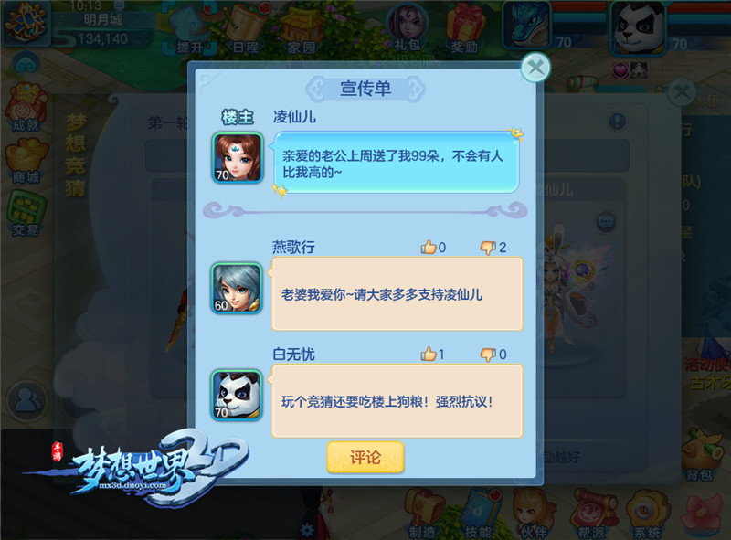 《梦想世界3D》新服“国色天香”今日开启!全新内容“物华天宝”正式开启,熊猫小宝,武动乾坤!全新80级光武上线,萌宠小宝降临梦想大陆!《梦想世界3D》回合新策略,多样玩法开启不一样的战斗体验!冲新服、抽神兽,各种好礼送送送!想知道游戏内安排了哪些精彩的内容、丰厚的奖励?快随小编一起,先睹为快~ 梦想竞猜 全民答题 《梦想世界3D》推出的全新玩法梦想竞猜是一个和玩家息息相关的答题活动,每天18:50分活动预开启,随机从题库中抽取一道关于玩家的问题,而备选答案则从全服在线玩家中抽取3名。分别在第一/第二/第三轮答对的玩家可获得奖励,越早答对奖励越好。 公布线索 逐轮开放 活动开启后,作为备选答案的玩家可以在18:50~19:00进入活动界面为自己写下宣传语拉票。19:00开启第一轮竞猜,其它玩家进入界面选择答案,此时解锁第一个与答案相关的线索。之后每隔10分钟开启一次竞猜共3轮,19:30分公布正确答案,得到票数最多的备选答案可以获得一份大奖。 独有天赋加持 厉害也要萌萌哒 熊猫小宝是本次全新内容”物华天宝“的小主角,作为新手宠,小宝不仅有着俏皮可爱的外型,惹人垂目,战斗力也是十分不俗。在独有战斗天赋—“追星赶月”的加持下,小宝在面对速度比自己低的敌人时,会一定几率触发额外的普通攻击,更厉害的是,额外攻击会出发追击效果,在单体输出能力上,小宝可谓是新手宠里独树一帜的存在啦!心动啦?心动不如行动!即刻前往官网领取新手礼包,进入游戏,长按右上角福利按钮,便可免费领取梦想小宝! 关于《梦想世界3D》手游 《梦想世界3D》手游今日全平台公测开启!招式靠领悟,回合真策略!见招拆招更鲜活,216种招式相生相克尽展极限回合策略。释放想象,海量玩法极具创意,闯迷宫泡温泉惊喜等你来探。碎片收集萌宠进化,宠物养成独具特色。萌娃天降,浪漫社交温情相伴,同城好友推荐,享受真实梦想人生。更有炫酷时装翅膀、搞怪头饰、清凉泳装,独特外观百变搭配任你选! 了解更多相关信息,请前往http://game.yzz.cn/html/info-2292.html |