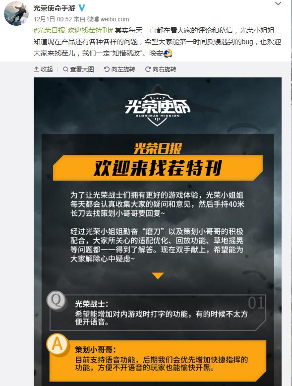 自腾讯旗下首款百人战术竞技手游《光荣使命》上线以来,因为其自身部分优化问题导致玩家体验受到影响,面对市场和产品双重压力之下,《光荣使命》项目组并没有放弃,项目组连续多天辛苦奋战不断加强游戏优化,改善游戏体验,据统计《光荣使命》先后修复游戏内BUG和功能优化等总计100多项,官方积极应对的态度和对产品打磨的决心,获得了玩家的认可。 回顾《光荣使命》的版本更迭进程,官方先是将影响玩家游戏体验的部分问题进行了修复,如将首轮缩圈时间增加30秒、载具刷新数量提升10%,以及解决角色落地依然显示降落伞、自动匹配没有显示玩家昵称、匹配模式无法切换等问题。同时考虑到玩家所处环境影响,官方还将组队主界面默认关闭麦克风,开启喇叭以防打扰他人。 在给游戏内部进行体验调优的同时,一直以来被认为是腾讯系产品最大优势的社交系统,借助其“一键邀请好友”功能可以满足玩家拉好友开黑的需求,《光荣使命》对此也极为重视。除了对好友开黑匹配系统进行了全面调整外,好友排行榜、头像、分享等每一个细节功能都得到了完整优化。不仅如此,一部分iOS用户反馈打开“客服”后显示空白这一问题也被官方及时修复。 《光荣使命》虽然因为此前版本的不够完善影响了玩家的游戏体验,但该款产品本身的亮点还是受到玩家认可的。比如《光荣使命》游戏内的天气系统是目前市面所见同类型产品中最为丰富的,一共有晴天、雾天、多云、清晨、黄昏、夜晚六种天气,前三种为常见的气候变幻,后三种则是带有时段特征的天气时节,其中夜晚模式更是《光荣使命》率先推出的天气。游戏中不同的天气,都会对玩家游戏过程带来不一样的影响,最明显的例子如雾天、夜晚对视线的影响。因此玩家在体验游戏的过程中往往需要思考更多的战术思路,来应对不同的天气,这其中所产生的游戏乐趣也不尽相同。 在玩家不断反馈意见,官方积极针对问题进行修复下,游戏的整体品质和各项功能体验都在不断完善。据了解,《光荣使命》通过在全网多个渠道建立与玩家正面对话的平台,主动引导玩家积极反馈游戏内所遇到的问题,并在第一时间将所存在的问题一一解决,既表现出了足够的诚意,也回应了玩家的反馈和期待。 了解更多相关信息,请前往http://game.yzz.cn/html/info-678.html |