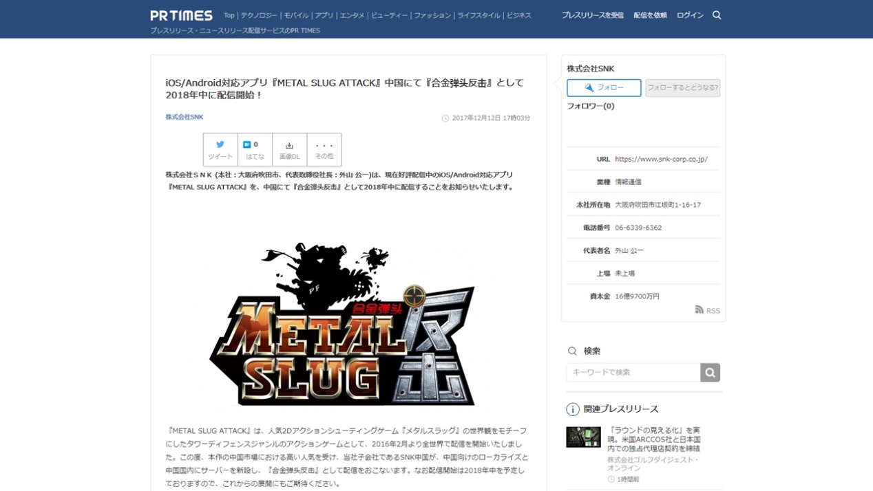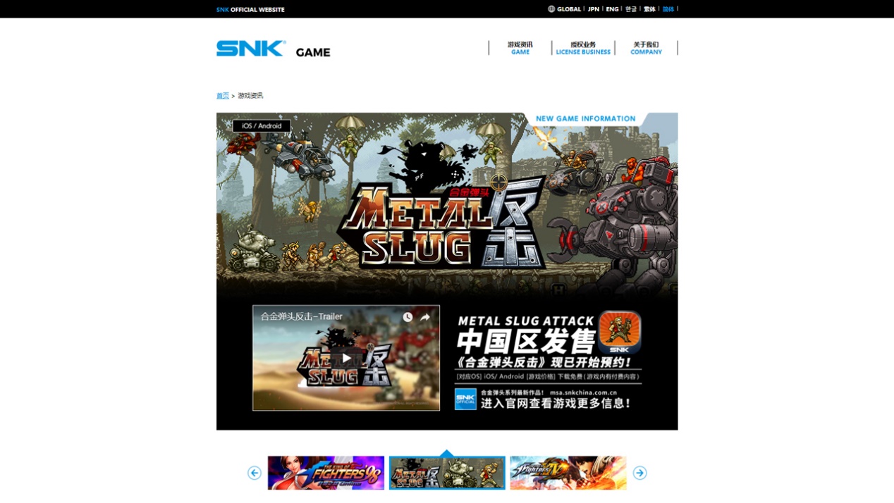 SNK官方宣布:集团旗下合金弹头系列最新作品《METAL SLUG ATTACK》将在中国架设服务器,并将由SNK中国进行游戏本地化,中国区定名《合金弹头反击》。随后,SNK中国确认了这一消息。该游戏是SNK为纪念合金弹头系列20周年而发售的手游作品,在12个国家累计1000余万下载量,获多个国家AppStore精品游戏推荐。 《合金弹头反击》由SNK开发,是合金弹头系列最新作品。游戏采用顶级2D像素点绘,不仅还原系列画风,还将再现游戏经典原声。作品囊括合金弹头历代角色,可操控单位多达400余个。在游戏中不仅可以探索各角色背后的故事,还能了解合金弹头系列隐藏剧情设定。游戏包含多种对战玩法,并支持全球玩家实时匹配,可以尽情体验丰富有趣的策略对战。 游戏首部宣传PV: 目前,《合金弹头反击》中国区官网已上线,游戏预约火爆进行中,玩家可登陆官网了解详情。 系列正统新作 还原经典记忆 《合金弹头反击》是合金弹头系列最新作品,在合金弹头系列20周年之际由SNK开发并在全球发行。作为系列正统新作,在保持原作风格的基础上,《合金弹头反击》致力于打造更加适合移动端的游戏体验。 游戏采用深受玩家喜爱的顶级2D点绘画风,帮助玩家重拾童年的经典回忆。游戏不仅囊括了合金弹头系列经典角色、特殊武器、载具以及历代BOSS,还将传承经典声音,无论音效还是音乐都能带给玩家原汁原味的合金弹头世界体验。 历代单位全收录 400+可操控角色 正规军、反叛军、外星人、托勒密军、原住民共计400余个可操控角色将悉数出现在游戏中。在前作中无法操控的野怪,BOSS等角色在本作中也将成为作战单位,可以在玩家的控制下进行行动,尽情满足广大玩家的收集欲望。 剧情深度挖掘 角色背景揭秘 合金弹头系列虽然有着宏大的世界观,但由于游戏类型的原因无法展开。在《合金弹头反击》中,前作中的经典剧情将会被重新演绎。玩家还可以挖掘系列隐藏的剧情设定,被解救俘虏的身世、外星人的来历都将在本作中得到一一解答。 不仅如此,游戏中还对所有收录的单位进行了攻击方式介绍和设定说明,玩家可以深度探寻每个单位背后的故事。克拉克不为人知的武器、莫丁将军的真实身份、莉安娜的猫娘形态也将在游戏中做出详细介绍。 全球实时匹配 丰富的策略玩法 《合金弹头反击》不同于前作单一的横版射击游戏玩法,拥有更多适用于移动设备的全新玩法供玩家体验。游戏支持作战单位编队,能够依靠不同策略组合进行作战。此外,游戏还加入了实时匹配对战玩法,全球玩家均可在同一服务器中进行战斗。 关于《合金弹头反击》 《合金弹头反击》由SNK开发,是合金弹头系列最新作品。游戏采用顶级2D像素点绘,不仅还原系列画风,还将再现游戏经典原声。作品囊括合金弹头历代角色,可操控单位多达400余个。在游戏中不仅可以探索各角色背后的故事,还能了解合金弹头系列隐藏剧情设定。游戏包含多种对战玩法,并支持全球玩家实时匹配,可以尽情体验丰富有趣的策略对战。 关于SNK SNK,一家总部位于日本大阪的游戏公司。公司主营业务为家用主机、PC、移动端等多个平台游戏研发、旗下IP管理以及游戏事业衍生等内容。公司理念为“The Future Is Now.(未来即现在)”,将创造出让全世界都能感受到的富有魅力的游戏。SNK曾经给玩家提供无限的游戏快乐,至今依然被世界各地的粉丝所厚爱。未来,SNK将传承公司前辈们的制作理念,秉持开拓精神,继续核心游戏研发,为大家带来更高层次的娱乐体验。 关于《SNK Playzone》 《SNK Playzone》支持拳皇系列、侍魂系列、合金弹头系列等多款经典街机游戏的联网对战平台,轻松匹配,即时好友联机,多种社交玩法,满足当年的街机梦! |