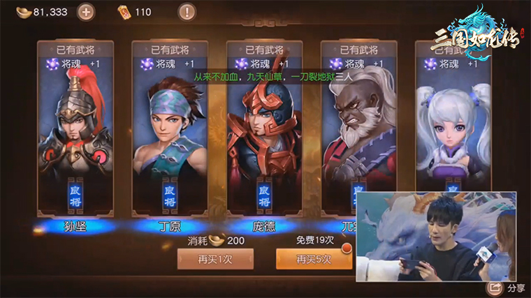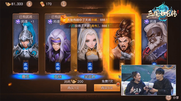 12月15日晚19:00,人间精品大张伟穿越到了《三国如龙传》的世界之中,上演了一场穿越大秀。在这场秀中,大张伟为玩家现场展示抽取三国武将的正确姿势,究竟他是欧皇还是非酋?看完下面这段视频大家都知道了! 百万玩家见证,150连抽验证血统 12月15日晚,人间精品大张伟如约而至,为玩家上演了一场三国穿越大秀,这一大秀吸引了将近百万玩家和观众前来围观。 也许是观众的热情应援,让大张伟有些飘飘然,以至于立下flag,表示自己可以在接下来的150连抽中,至少抽到138张橙卡。不料志得意满的大张伟惨遭“读心”,频频喜迎葫芦娃五连,非酋血统似乎无可置疑。 花式解锁,新姿势抽卡更轻松 为了改变自己的气运,大张伟也开始求助于各种“玄学”。除了用木桶洗手之外,还要求摄影师为其打光让脸更白。他还解锁了各种不同姿势,时而45°角仰望星空,时而思考人生,但不论使用何种玄学,都难以唤醒欧气。就在无数观众认为大张伟将一无所获时,他与现场女玩家玻璃珠以一招挽手虐狗式,竟福至心灵抽得了双橙卡。引来不少观众也通过弹幕大刷“666”,纷纷表示“学到了抽卡的正确姿势”。 再接再“立”,大张伟又立flag 面对自己突然而来的欧气,大张伟也在现场与玩家分享了自己的偷渡经验,表示“世上无难事,只要肯放弃”,当对于抽卡没有什么念想时,欧气自然就会来了。为了验证自己的这一观点,大张伟更是把手机递给了玻璃珠,要求她也来验证自己的血统。为了“鼓励”玻璃珠,大张伟甚至再立flag,表示若是玻璃珠能够抽出橙卡,他能够在现场把沙发吃掉。话音刚落,玻璃珠就抽出了许褚,秒收flag。而观众也在大刷弹幕,称大张伟不愧是“flag”之王。 短短一个小时的三国穿越秀虽然已经落幕,但是人间精品大张伟却为《三国如龙传》玩家留下了无数惊喜。除了150武将连抽之外,他还在现场为玩家演绎了他为《三国如龙传》创作的歌曲。而《三国如龙传》也通过全服在线抽神将、为大张伟打call赢取神将魂魄、五连招募半价、大张伟抽卡全服送礼等活动,让玩家与大张伟一同分享快乐。在未来,《三国如龙传》也将一如既往地为玩家带来丰富多样的游戏玩法和有趣的游戏活动,让每一个玩家都能在这个世界中,找到快乐与惊喜! 了解更多相关信息,请前往http://sy.yzz.cn/sgrlz/ |