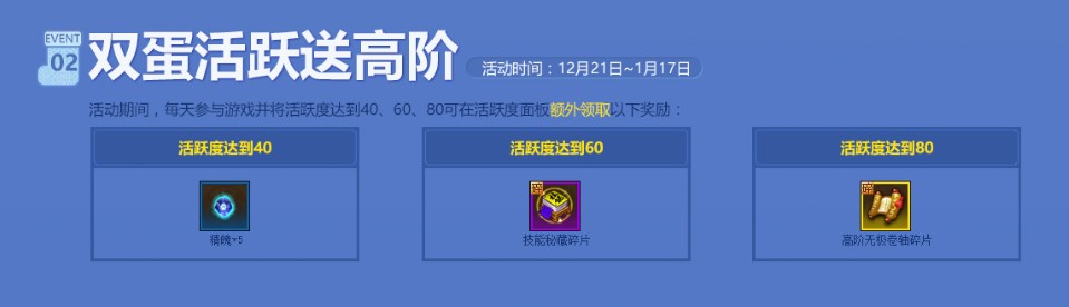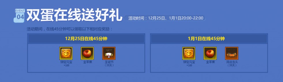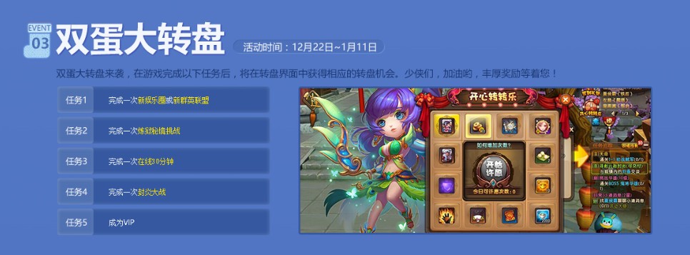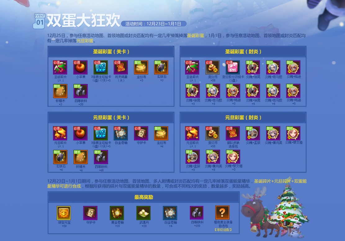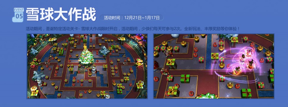喂!醒醒,快出被窝,《梦塔防S》礼物来敲门啦!一年一度的圣诞节和元旦马上就要到来了,而这一次在白雪皑皑的冬天,游戏也为大家准备了很多节日礼物,和活动地图,千万不要错过哦!! 活动一:双蛋大狂欢 《梦塔防S》双蛋大狂欢,圣诞元旦双蛋节日期间,参与封炎、关卡都有几率掉落彩蛋与双蛋能量精华,彩蛋可开出碎片,碎片与双蛋能量精华合成可获得丰厚的奖励道具,更有机会获得等级适配的橙色君主装备哦~ 活动二:双蛋活跃送高阶 活动期间,《梦塔防S》玩家每天在游戏中累计活跃度达到一定数值即可额外活动奖励道具,每天活跃度80更有高阶无极卷轴碎片可以免费领哦。集齐10个碎片就能合成1个高阶无极卷轴,快去进阶你的神器吧。 活动三:双蛋大转盘 《梦塔防S》开心转转乐再次来袭,每天在游戏中完成指定任务后,即可在转盘界面中获得相应的转盘机会。有机会获得圣诞底座、紫色技能、蔡文姬炎魄以及圣诞限定皮肤等极品道具,少侠们加油哟! 活动四:双蛋在线送好礼 双蛋狂欢,少侠们在《梦塔防S》圣诞与元旦当天20:00-22:00,登录游戏并在线满45分钟即可获得大量绑元奖励,还有金苹果和节日底座赠送哦~ 活动五:雪球大作战 喂!快来一起去《梦塔防S》过圣诞吧~ 了解更多相关信息,请前往http://mtf.yzz.cn/ |