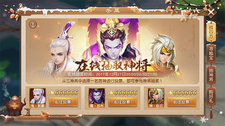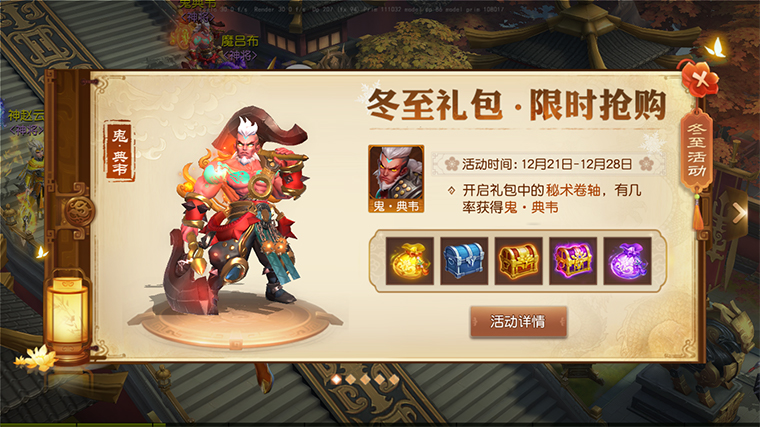 冬至节的脚步已经临近。在古人看来,自冬至起,白昼一天比一天长,阳气回升,天地阳气开始兴做渐强,代表下一个循环开始,因此,冬至是大吉之日。在这一年之中最冷的时节,《三国如龙传》将陪伴你身边,为每一个玩家送上暖心大礼:在12月21日~12月28日期间,六大活动与玩家共庆良辰,愿这份温暖能够相伴各位玩家整个寒冬。 庆典降临,全新神将鬼·典韦与你同欢 一年一度的冬至庆典降临,为了感谢玩家对《三国如龙传》的支持,在活动期间,《三国如龙传》庆典福利活动,为玩家送上三重暖心好礼! 每日登陆送福利:玩家每日登陆即可免费领取冬至暖心礼包,内含秘术卷轴、易经丹、雪球等诸多冬至福利!更有小蝉精心准备的五谷丰登礼包,助你洗炼打造好运连连~ 特惠礼包限时抢:在活动期间,每位少侠都可以超低价秒杀特惠礼包,打开礼包,玩家将必得1个神将魂魄!除此之外,还有神兵利器宝箱、金戈铁马宝箱、神枢鬼藏宝箱、冰雪福袋等特惠礼包限时抢购。大量神将魂魄、紫龙玉玦限定放出,帮助每一个玩家早日兑换神将,纵横三国世界!需要注意的是:每个冰雪福袋中都可开出冰雪礼花。使用冰雪礼花可在当前场景召唤漫天飞雪,并有几率获得冬至帽装饰,甚至可能开出增加超高颜值属性的紫罗兰冬至帽! 全新神将鬼·典韦:伴随冬至活动的开启,全新神将鬼·典韦也会现身三国世界。在所有冬至礼包中,都为玩家准备了数量不一的秘术卷轴,只要打开秘术卷轴,就有几率直接获取神将鬼·典韦!也许那个鬼·典韦青睐的天选幸运儿,就是你! 战斗不停歇,三大活动为君奉上满满福利 除了庆典福利活动外,《三国如龙传》还为等级≥30级的玩家送上了三大战斗相关类游戏活动。 平定安邦:玩家不论是单人还是组队,都可以前往洛阳城雪姬处领取5环任务,帮助神州百姓驱除不法之徒,并为自己获取大量经验、银币和节日积分奖励。 营救旺财:玩家只要3人组队,即可与雪姬对话了解旺财失踪的线索,营救旺财并为自己赢得丰厚奖励和侠义积分奖励! 魔族入侵:在活动期间的每天12:00~12:20、18:00~18:20,异界魔族就会突破封印,前来三国世界捣乱。玩家可以单人或多人组队,前去满足他们的愿望,或者通过战斗给他们一个教训,让他们还三国世界一个和平。 寻觅三国秘宝,三国第一男神由你决定 另外,在活动期间,玩家还可以体验两大特色单人玩法。 冰封秘宝:玩家只要完成指定次数的日常活动,就可以获得破冰之锤。使用这一道具,就可以打开一件冰封秘宝,赢取丰厚奖励。听说,在这些秘宝之中也藏有秘术卷轴,打开卷轴就有机会直接获得神将鬼·典韦! 如龙男神:玩家可以每天在活动界面,在神赵云、魔吕布、鬼郭嘉三位如龙男神中,选择一位为其投票打call。在投票之后,玩家不仅能获得丰厚奖励,在活动结束后,系统还将从投票玩家中抽取三个神将。向单一神将投票越多,获奖概率也会越大哦! 现在,《三国如龙传》2017冬至活动即将全面开启。整整六重惊喜,让每一个投入其中的玩家都能获得满满福利。在体验这六大活动过程中,相信每一个玩家也将对《三国如龙传》这个大世界,有更深入的了解! 了解更多相关信息,请前往http://sy.yzz.cn/sgrlz/ |
