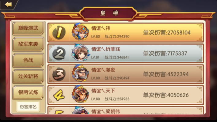 由深梦游戏独家代理的奇幻穿越微操作手游《雷鸣三国》,在所有玩家心中最重要的,莫过于银两该怎么赚到!而银两试炼!就是成为土豪的真正关键! 银两试炼: 在玩家进入主页的军机处后,就会看到各种各样的试炼,而其中的银两试炼尤为重要,直接可以影响玩家的财富收入! 但银两试炼说来简单,具体应该如何才能得到更多宝藏,变身土豪玩家呢?今天,给大家分享一波,银两试炼,又叫有钱人教学。毕竟有银两才能升级技能,没事十连,走向人生巅峰! 话不多说,步入正题,当你看到这些玩家的排名时有多羡慕,就要去注意对方究竟用的什么阵容! 阵容选择:徐晃+小公主+水镜+周瑜+张春华 阵容宗旨,因为对面智商低,首先就要选择周瑜输出爆棚,主力是不停的火烧赤壁。 技能释放选择,水镜大招聚怪,周瑜大火球丢下去,徐晃和小公主可劲煽风点火,张春华作为辅助大佬。 之所以选择徐晃,因为这是大部分玩家十连最容易得到的一位,风力十足。比关二哥风力强,持续时间持久 再谈小公主,后宫可生可换,获取容易,升级简单。也是一个风属性强力的法师! 最后还有一位小编特别期待的大神,那就是马超大大,听说他可以无视防御,风力很强的样子,重点是,他还骑马,相信肯定以后作用十足的样子。目前情况,银两阵容一局打200万很轻松,说不定马超出来能破300万,一看就很让人期待! 还想了解更多《雷鸣三国》就来下载游戏,和我们一同闯荡三国奇幻世界! 了解更多相关信息,请前往http://game.yzz.cn/html/info-5605.html |