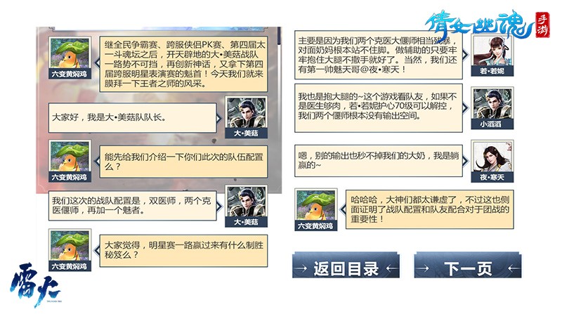 继全民争霸赛、跨服侠侣PK赛、第四届太一斗魂坛之后又拿下明星表演赛的魁首。熟悉他们的玩家都知道,在全民之后大蘑菇战队一路势不可挡,无数豪强战队在他们面前饮恨。如今王者再创新的神话,是否已经没有人能阻止他们的神话之路呢?本期倩女幽魂手游膜拜榜就带领玩家们走近神秘的大·美菇战队,揭开王者战队的神秘面纱! 【王者战队赛后感言 致胜秘笈竟是“躺赢”?】 大·美菇战队的队伍配置是两个偃师,两个奶妈加上一个魅者。在本次访谈中,当问到获胜技巧时,倩女手游大神魅者夜寒天谦虚的称自己是“躺赢”的。其实不然,我们知道,倩女手游团战时都是以优先击杀对方脆皮和奶妈为主的。大·美菇战队的作战方案更是如此,魅者负责控制对面输出,为两位偃师集火击杀对面奶妈赢取时间。想要“躺赢”比赛,团队不仅需要拥有极品的装备和风骚的操作,而且默契的团队合作和优秀的作战指挥也是必不可少的。 【明星赛事龙虎争霸 高手对决惺惺相惜】 在高手对决中,实力强劲的对手总是可遇不可求,比赛中面对实力强大的对手,既是一种挑战又是队伍进步的机会。其中以此深情共此生战队与大·美菇战队两度交手,在首次交战失利后,从败者组顽强归来,虽然最终还是复仇未果,但仍然值得尊敬。 当提到比赛感受时,大·美菇战队成员纷纷表示对手实力都很强大,尤其是其中的李白战队,给他们留下了深刻的印象。该队伍的魅者实力走的是超级强混路线,连医生都能混住。李白战队在比赛中表现出来的雄厚实力,让大·美菇战队成员都觉得十分棘手,相信经过此次交手,下次两支队伍相遇将为我们带来更加精彩的对战。 【大神讲述魅者技巧 倩女膜拜再添新榜】 倩女手游里,魅者的控制技能极富变化,弹指间能够决定队伍的胜败,所以一直都是令输出和奶妈头疼的职业。在谈到魅者的实战技巧时,大·美菇战队的夜寒天表示,魅者在团战时的作用主要还是要以强控制为主,同时要具备很强的意识和操作。魅者对决中,当面对同样具备强大实力的对手,要冷静判断找准时机,掌握自己的技能节奏,才能发挥魅者职业的优势。 本期称霸三界再添新榜爱宠大冒险来自【琴瑟和鸣】的玩家【_Smile·甜心】以157614次的灵兽洗练次数夺得榜首。本次野外杀人榜中来自【雪中情】的无心ぃ法师以23433次击杀占据第一位,而死亡次数榜榜首【_佐手、幽魂】死亡次数竟然高达100962,次数接近击杀榜首的5倍。其他更多精彩排行,详情尽在本期膜拜榜! 新一代国民手游《倩女幽魂》是《新倩女幽魂》端游的官方手游,拥有端游级唯美画风与人设,传承经典玩法,男神胡一天化身NPC守护美好!渡劫飞升玩法、丰厚春节福利、寒假打雪仗副本即将上线,春节狂欢全面开启中! |