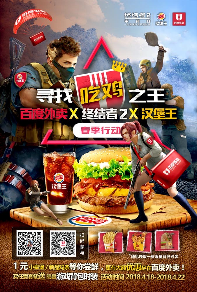 做至尊王者,吃皇堡香鸡!网易战术竞技射击手游《终结者2:审判日》牵手汉堡王与百度外卖,共同打造畅爽吃鸡之旅,线上线下美食热血齐开战! 4月18日至4月22日期间,《终结者2》将在线下开启“寻找吃鸡之王”主题活动,无论你是游戏高手还是美食大胃王,都能够一显身手,包揽吃鸡界的终极快乐。 异业合作,《终结者2》打造美食补给包 在此次活动中,百度外卖、汉堡王、《终结者2》三方首次开启异业合作,将吃鸡玩法与美食文化融为一体,让玩家在感受酣畅淋漓的枪战竞技之时,还能够享受到鲜香可口的真鸡美味。早在去年的11月份,刚刚上线不久的《终结者2》就与百度外卖开展了深度合作,“百度外卖”的主题出现在定制跳伞、特定时装、载具及补给包等物品上,为玩家带来了浓厚的生活气息,也让战场上的“点外卖、送快递”欢乐气氛更加强烈。 在活动期间,玩家只要通过百度外卖app购买汉堡王任意餐品,均有机会随机领取一款汉堡王限定背包,背包造型分别为:汉堡、薯条和炸鸡,背在身上更具“风味”。 同时,百度外卖还推出汉堡王专用补给券,凭借该券可享受汉堡王《终结者2》单人套餐四折优惠补给券通过邮件形式发放给全服玩家,游戏内外双吃鸡的乐趣千万不要错过。 线下同欢,收集闪卡欢乐捡包 除了坐等外卖上门,玩家还可以前往汉堡王的线下门店收获吃鸡福利。在全国50个城市多达584所汉堡王门店中,购买任意套餐均可获得《终结者2:审判日》定制闪卡一张。这张闪卡不仅具备极强的收藏价值,同时还含有“彩蛋”,卡片上的兑换码可以用于兑换限定背包,先换先得。 在北京、上海、广州、杭州的线下四家主题门店中,玩家还可以亲身体验一把《终结者2》的现实竞技玩法。店内设置的射击区域可供玩家尽情对战,还会提供免费鸡盒等“补给”,乐趣不输线上开黑。同时,门店的角落中还散落着大量的周边道具,带给玩家“捡包”的别样乐趣,如果能够集齐“三级头、三级甲、三级包”的话,还可以获得礼品一份。此外店中的道具棒棒糖,也可以让玩家感受一下真正的“舔包”。 一元秒杀,线上福利更多惊喜 门店之外,惊喜犹多。《终结者2》与汉堡王在全国范围内发起了“堡护荣誉易起吃鸡”活动,为玩家送出海量一元秒杀的超级福利。只要花费一元钱,就能够享受到酷黑鸡条、小皇堡的绝佳美味,更有4折单人吃鸡套餐和6折双人吃鸡套餐的给力优惠。 《终结者2:审判日》与百度外卖、汉堡王的合作惊喜不止如此,4月20日晚8点前往杭州滨江宝龙城市广场汉堡王门店,一场“寻找吃鸡王”的精彩战斗即将开启!届时现场将直播【大胃王朵一】与健美季军的吃汉堡大战,并为观众送出百度外卖券及游戏内全套定制背包福利! 足不出户尽享多重惊喜,线上线上畅快吃鸡!《终结者2:审判日》异业合作开启美食福利季:汉堡鸡条送货上门,福利惊喜遍地开花,让吃鸡乐趣来得更猛烈一些吧! 《终结者2:审判日》电影官方手游官网:http://t2.163.com/ 《终结者2:审判日》电影官方手游官方论坛:http://t2.16163.com 《终结者2:审判日》电影官方手游官方微博:终结者2审判日电影官方手游 《终结者2:审判日》电影官方手游官方微信:终结者2审判日电影同名手游 关于《终结者2:审判日》: 百万人同服!单局最高300人开黑!3D高清画质大世界,多元地形丰富场景,64平方公里超震撼战场,海陆空三维颠覆性对战体验;伏地硬刚听声分辨位,紧张刺激血脉喷张!载具狂飙激情碰撞,上演精彩时速之战!百变装备自由搭配,尽显独门策略战术!《终结者2:审判日》将带给你极致的快节奏枪战竞技体验! |