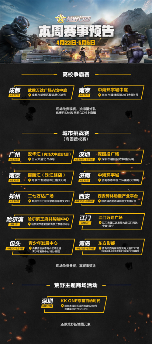 一年一度的五一小长假即将到来,你是否已经做好假期规划,准备好如何畅玩三天了呢?除了出门旅游和宅家休息,《荒野行动》也为你解锁了第三选项——假期将至,赶快前往线下体验横跨全国12城的海量荒野赛事吧! 今年五一小长假期间,全国多座城市将迎来《荒野行动》高校争霸赛和城市挑战赛两大赛事,各位玩家可以通过线上观看或者亲身参与家门口的荒野赛事,度过一个意义非凡的假期。除此以外,《荒野行动》首个线下主题商场也即将开放,参加完紧张刺激的比赛后,来主题商场一览《荒野行动》游戏世界的独特魅力吧。 作为《荒野行动》官方授权的商圈赛事,城市挑战赛将在五一期间落地全国10座城市,其中包括广州,深圳,南京,济南,郑州,西安,哈尔滨,江门,包头和青岛。从最南端的深圳站到最北端的包头站,几乎纵跨半个中国,如此大手笔的投入旨在为全国热爱《荒野行动》的玩家打造一个线下开黑聚会的赛事舞台。与此同时,城市挑战赛没有任何参赛门槛,凡是年满16周岁的玩家均可来到现场免费报名参与,除了摘得比赛名次获得赛事奖金外,还可以参与现场的海量抽奖活动。有了此等福利,还需要什么诗和远方。 另一项《荒野行动》的经典赛事“高校争霸赛”也将在五一期间来到成都和南京两城。作为以竞技为主要看点的高校争霸赛自3月开赛以来便吸引了众多荒野爱好者们的加入,本次成都,南京两站的参赛选手均是从线上预选赛中脱颖而出的选手,实力不容小觑。身在这两个城市的玩家可以在比赛当天免费前往线下观赛,主办方也在现场设置了大量抽奖活动,到场玩家将有意想不到的收获。另外,如果现场选手出现缺席的情况,现场观众可以补位参赛。所有玩家也可以进入网易CC直播在线上观看比赛,共同瓜分10万元直播好礼。 而对于非硬核游戏爱好者而言,在这个五一假期中也可以感受到满满的“荒野风情”。《荒野行动》官方与深圳KK ONE商场强势联动,举办了为期一个月的《荒野行动》主题商场活动。从5月5日开始,作为深圳核心商圈的KK ONE商场不仅将在布置上对游戏中的全新地图“飓风半岛”中的大量地标建筑进行还原,还将不定期举办商圈赛事活动。各位深圳地区的小伙伴们一定不要忘了前来体验,感受火箭发射基地、武直十直升飞机等经典的荒野地图元素。 五一小长假将至,你还没决定好怎么过吗?快叫上三五好友一同前往你所在城市的指定商场,和身边的荒野同好们一同参与到两大荒野赛事中来空降开黑吧!相信今年这个五一你将过得与众不同。 了解更多相关信息,请前往http://sy.yzz.cn/hyxd/ |