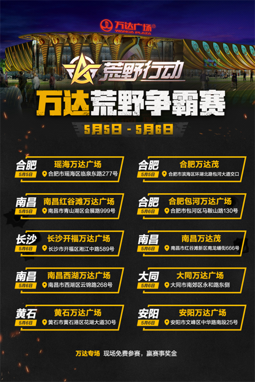 虽然五一假期已经告一段落,但《荒野行动》的精彩赛事活动还在继续。本周末,《荒野行动》官方将联合全国多地万达广场,举办“万达荒野争霸赛”。我们已经准备好空投好礼,迎接你的到来。 首周“万达荒野争霸赛”为期两天(5月5日-5月6日),覆盖全国6座城市10处万达广场,这些城市包括:合肥,南昌,长沙,大同,黄石,安阳。届时,活动现场不仅有专业的cosplay、街舞表演为玩家打call,海量比赛奖金及现场随机发放的空投好礼也在等待你的领取。 无论你是热爱《荒野行动》的忠实玩家还是此前未接触过本作的用户,均有机会在线下一览这款游戏的魅力。参加赛事活动,赢周边奖金,尽在本周末“万达荒野争霸赛”! 活动地址: 合肥市 (5月5日)瑶海万达广场:合肥市瑶海区临泉东路277号 (5月5日)合肥万达茂:合肥市滨海区环湖北路包河大道交口 (5月6日)合肥包河万达广场:合肥市包河区马鞍山路130号 南昌市 (5月5日)南昌红谷滩万达广场:南昌市青山湖区会展路999号 (5月6日)南昌万达茂:江西省南昌市红谷滩新区南龙蟠街666号 (5月6日)南昌西湖万达广场:南昌市西湖区云锦路268号 长沙 (5月6日)长沙开福万达广场:长沙市开福区湘江中路589号 大同 (5月6日)大同万达广场:大同市南郊区永和路东侧 黄石 (5月6日)黄石万达广场:黄石市黄石港区花湖大道30号 安阳 (5月6日)安阳万达广场:安阳市文峰区中华路南段25号 了解更多相关信息,请前往http://sy.yzz.cn/hyxd/ |