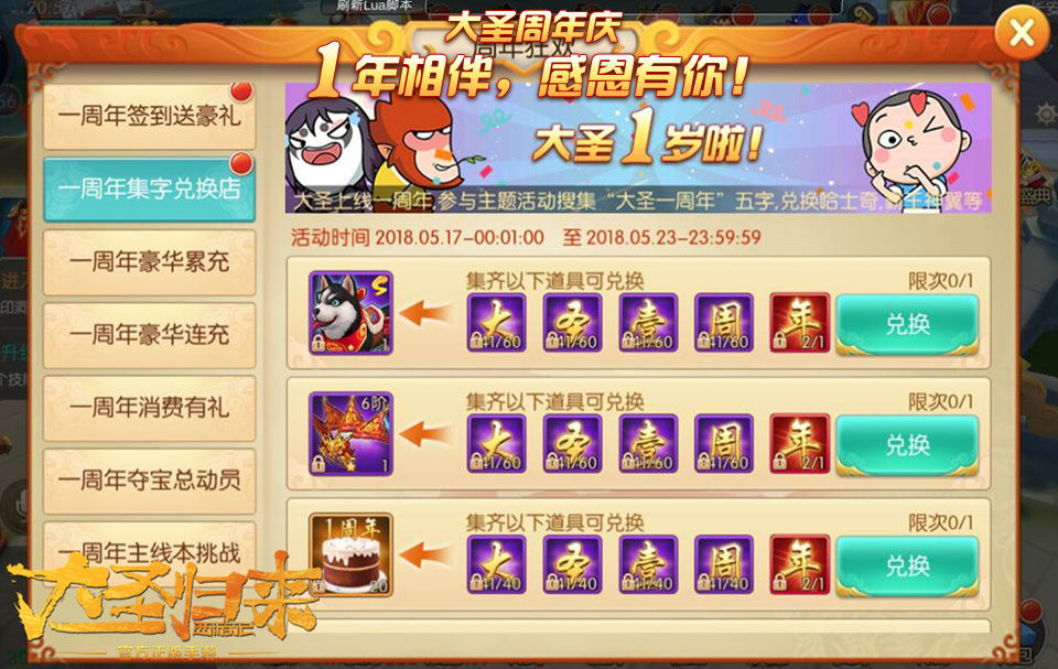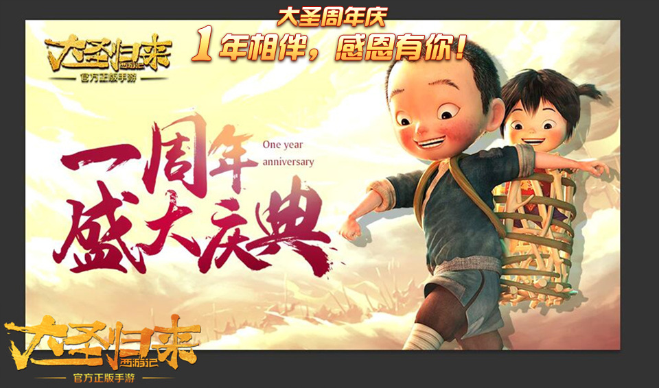 1年相伴,感恩有你!官方唯一正版授权、3D ARPG手游《西游记之大圣归来》周年狂欢盛典今日震撼开启。电影原版小白龙幻化为SS坐骑入驻三界,霸气大圣真身化作飞天翼助力玩家上天入地,更有七百万金币、千元元宝登录就送,欢庆周年狂欢盛典! 电影原版小白龙坐骑上线 霸气闹三界 《西游记之大圣归来》手游改编自同名票房冠军国漫电影,游戏从剧情和角色上都高度还原经典原则。为庆祝一周年,电影原版小白龙将幻化为SS坐骑震撼现世。大圣曾言:“如果你足够坚强,那么你就可以驾驭它。”如今三界众生终得一睹真容,驾驭着小白龙闹翻三界吧! 红披风加身!齐天大圣化身飞天神翼 梦想不死,我们不散!除了小白龙入驻坐骑系统外,齐天大圣孙悟空在周年庆之际,也将以特别的形式永远陪伴我们。全新翅膀“大圣飞天翼”震撼上线。大圣幻化为左右“护法”,金光加持,融石为甲,烈焰成袍。助力玩家上天入地,共同维护三界和平! 登录就送金币元宝 “大圣一周年”集字狂欢 《西游记之大圣归来》手游在周年庆期间,为广大玩家准备了无门槛领取豪礼。5月17日至23日,888888铜币、100~200元宝每天登录就送!同时免费赠送体力丹、耐力丹、黄金宝箱,周一还可额外领取周年大礼包一份。 为庆祝《西游记之大圣归来》上线一周年,游戏还将在周年庆期间开设集字主题活动。【大】【圣】【一】【周】【年】将随机出现在各种活动、副本以及主线挑战中。当玩家搜集到一定数量后,将可以免费兑换极品坐骑哈士奇和极品翅膀霸王神翼、心跳之翼,嗨翻三界。 山妖入侵百人同图激战!掉落双倍庆周年 大圣周年庆,原本是个喜庆的日子,山妖之王却偏偏跑来捣乱,前往四海击杀山妖之王,还三界一个太平,让大家好好过周年庆!活动期间,参与击杀山妖的词数越多,获得的奖励越丰厚。游戏内所有奖励、掉落任性翻倍。竞技场、通天塔、秘境副本、挑战副本、闯天关包括主线挑战在内,核心掉落奖励翻倍。周年集字、4叶幸运草让每个玩家都有丰收的机会,快去狩猎这份大礼吧! 《西游记之大圣归来》由十月文化唯一正版授权、汪东城代言的3D-ARPG手游。游戏独创变身玩法,玩家将亲自扮演大圣,带领迷弟江流儿再度归来。英雄召唤系统让玩家轻松召集师徒四人,重温西游之路。周年庆版本5月17日震撼上线。到底谁能问鼎西行之路,还看各路英豪。 了解更多相关信息,请前往http://game.yzz.cn/html/info-5441.html |