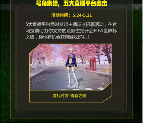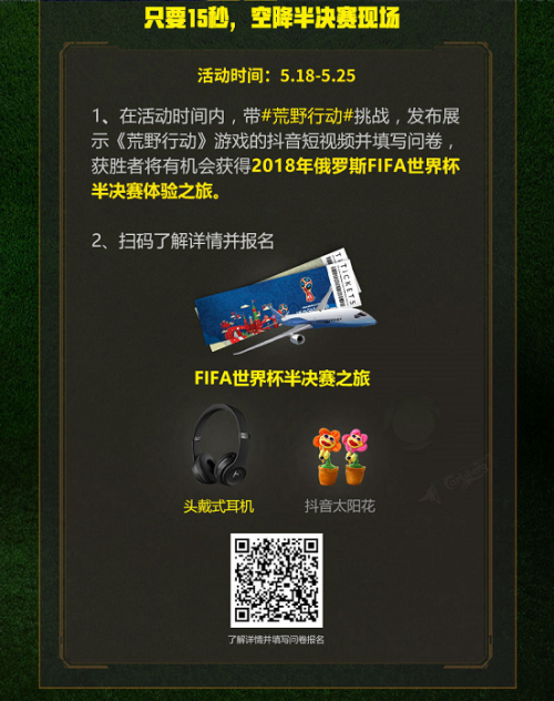 2018俄罗斯FIFA世界杯即将来临!想要亲临现场感受足球激情吗?《荒野行动》限时开启FIFA世界杯行动,带领荒野精英征战绿茵!众多活动目前已在如火如荼进行中,微博、微信、抖音等社交平台均可参与,活动形式丰富多样。一条微博、一段抖音都能送你去俄罗斯看FIFA世界杯啦!只要你参与进来,便能收获颇丰,更有机会赢取2018年俄罗斯FIFA世界杯半决赛体验之旅,如此良机怎能还不心动? 【微博活动:一键发微博 开启FIFA世界杯之旅】 5月28日至5月31日为票选期间,官博将从全部参赛作品中选出10份优秀投稿进行公开微博票选,前10名玩家将获得价值100元的网易严选卡,获得第一名更将另外获得2018年俄罗斯FIFA世界杯半决赛体验之旅,快来发挥你的想象力吧! 【抖音活动:只要15秒 空降半决赛现场】 如果你是短视频爱好者,在5月18日至5月25日期间,前往抖音参与#荒野行动#挑战,发布原创展示《荒野行动》游戏的抖音短视频作品,并填写答卷即可报名参赛。 官方将根据符合要求的短视频作品点赞量进行排名,获得第一名的参赛者将获得Beat Solo3 Wireless头戴式耳机一副,第2-11名将获得抖音妖娆向日葵一个。若第一名获赞数超过10万,还将获得2018年俄罗斯FIFA世界杯半决赛体验之旅。快来用短视频秀出你的才艺! 【直播活动:号角集结 五大直播平台出击】 动手投票也能获奖!从5月24日至5月31日,熊猫直播,触手TV,网易CC直播,全民直播,龙珠直播五大直播平台将同时发起主播球迷的招募活动,只要你在此期间前往《荒野行动》官网投票助力你所支持的荒野主播开启FIFA世界杯之旅,便有机会获得游戏时装“青春之歌”。让荒野世界的所有人看到你的风采! 荒野精英,征战绿茵!《荒野行动》2018俄罗斯FIFA世界杯限时活动现已开启,有了荒野,今年的比赛一定会更精彩!即刻参与进来,你便有机会空降世界杯现场,释放你的竞技激情! 了解更多相关信息,请前往http://sy.yzz.cn/hyxd/ |