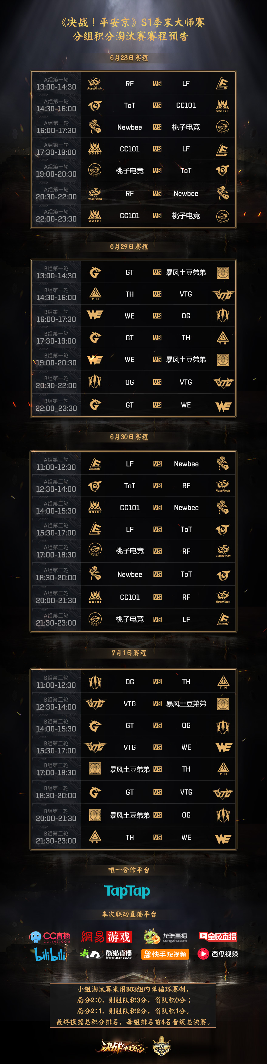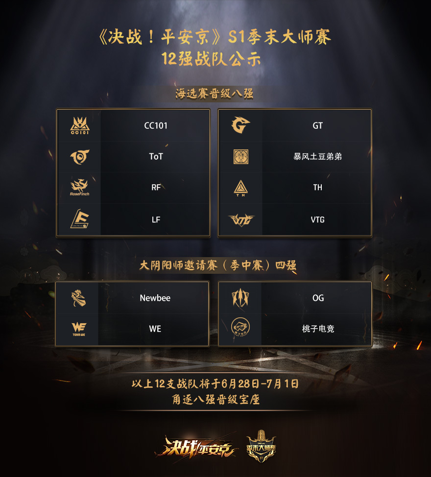 盛夏激战,《决战!平安京》S1季末大师赛火热开打!64支实力强队于平安京战场集结,于6月27日进行了激烈的海选赛角逐。最终,8支顶尖战队脱颖而出,并将于今日至7月1日,与大阴阳师邀请赛的4强战队会师,进行积分淘汰赛。最终,谁能问鼎季末大师赛,拿下冠军宝座?让我们共同拭目以待! 实力强队会师?争夺季末大师赛桂冠 昨日,入围《决战!平安京》S1季末大师赛的64强战队,经过27日一整天的实力对战,最终决出了海选赛8强,并正式晋级小组淘汰赛。海选赛八强分别为:CC101战队、ToT战队、RF战队、LF战队、GT战队、暴风土豆弟弟战队、TH战队和VTG战队。这8支战队将与来自大阴阳师邀请赛的4强战队Newbee、OG、WE及桃子电竞一同在小组淘汰赛的战场上争夺决赛的晋级资格。 争夺出线资格?小组淘汰赛赛制公开 《决战!平安京》S1季末大师赛小组淘汰赛赛制公开,小组淘汰赛将采用BO3组内单循环赛的赛制进行。积分规则如下: 1、局分2:0,即胜队连胜两盘,则胜队积3分,负队积0分; 2、局分2:1,即前两局打平第三局胜队获胜,则胜队积2分,负队积1分。 最终将根据总积分排名,每组排名前4名的战队晋级总决赛,第5、6名直接淘汰。 谁能晋级7月7、8日的决赛、问鼎《决战!平安京》S1季末大师赛冠军?让我们拭目以待。更多精彩内容,更全活动预告,请关注《决战!平安京》官方网站、官方微信。 【官方网址】 moba.163.com 【官方微信】 决战平安京 【官方微博】 @决战平安京 【官方贴吧】决战平安京吧 了解更多相关信息,请前往http://sy.yzz.cn/jzpaj/ |