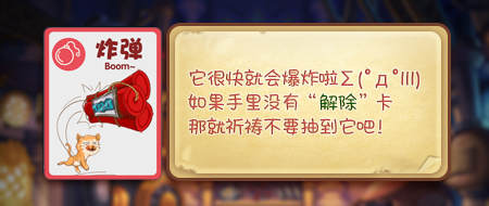 随着夏日慢慢展开了炎热的舞台,《推理学院》为大家带来的全新玩法:“炸弹猫”也正是开启了它的“惊奇之旅”!而这次,《推理学院》还将带来双倍惊喜——除了已优化完成的“炸弹猫”基础模式,《推理学院》还带来了更好玩更有趣的“疯狂模式”!在“疯狂模式”中,你不仅可以使用新的卡牌,还能够利用“疯狂模式”的随机性,将对手打得措手不及! 我已经迫不及待想要去《推理学院》玩一盘“炸弹猫”了!要一起来吗? 请开始你的表演>ω< 在游戏开始时,每个人都会获得随机的4张手牌以及1张“解除”卡牌。游戏将随机选择一位玩家开始他的回合,并按照顺时针方向进行游戏。 轮到自己的回合时,您可以根据自己的判断和策略打出手牌中任意张数的卡牌,或不打出任何卡牌。当你选择从牌堆顶部抽一张卡牌或打出特殊卡牌后,你的回合便随之结束。 当你不幸地抽到“炸弹”时,你需要立刻打出一张“解除”卡来抵消“炸弹”,之后你可以将这张“炸弹”卡牌按你的意愿悄悄加入到牌堆任一位置,你的回合结束。但当你抽到“炸弹”却无法打出“解除”的时候,就意味着你将立刻和那张“炸弹”一起被淘汰出局。 胜利条件 成为最后存活下来的玩家,即可获得游戏胜利! 疯狂模式详解 “炸弹猫”疯狂模式是《推理学院》为小伙伴们准备的全新模式,为了让“炸弹猫”充满未知与好奇带来的魅力,《推理学院》将会研发更多极具趣味的全新卡牌,并将它们加入到“疯狂模式”中。随着扩展卡牌的增多,小伙伴们在开启“疯狂模式”时,系统在当局游戏中,加入来自于“炸弹猫”扩展包的随机卡牌。 在以后的“炸弹猫”游戏旅程中,除了“下一张卡牌的未知”将能够带给你紧张与兴奋的感觉,当面对加入随机卡牌后的整个牌库,你还可以感到更多的好奇与惊喜!迫不及待地抽出下一张“关键”牌,然后给你的对手来一招出奇制胜的“套路”袭击! 在“普通模式”中的“炸弹猫”游戏卡牌均视为“基础卡牌”,与“扩展卡牌”作出区别。 卡牌说明 在 “炸弹猫”游戏中,将包含以下基础卡牌,所有的卡牌被打出后均会被放入弃牌堆,本局游戏不再使用—— 炸弹 每局游戏的“炸弹”数量永远比当局游戏玩家人数少1。它们被混在牌堆的任意位置,每当您不幸抽到“炸弹”的时候,您需要立刻打出一张“解除”来抵消“炸弹”的效果,并将这张炸弹悄悄放置到牌堆任一位置,否则将立刻被淘汰出局。 解除 在游戏一开始的时候,每个玩家都会获得一张“解除”卡。在每局游戏中,还会有两张额外的“解除”卡加入牌堆。“解除”卡只能在抽到“炸弹”的时候打出,并立即抵消“炸弹”,之后你可以将该“炸弹”放回牌堆任意位置。 抽底 在你的回合打出“抽底”,并立刻从牌堆底部抽取一张牌,然后结束你的当前回合。 休息 在你的回合打出“休息”,将立刻结束你的当前回合且无需从牌堆抽牌。 反弹 在你的回合打出“反弹”,将立刻结束你的当前回合且无需从牌堆抽牌,此刻游戏回合将从相反的顺序进行,直到下一张“反弹”打出之前,游戏顺序将不会改变(若之前以顺时针顺序进行游戏,则变为逆时针顺序进行;若为逆时针顺序进行游戏,则变为顺时针顺序进行)。 乞讨 在你的回合打出“乞讨”,并指定任一玩家,被指定玩家必须从自己的手牌中挑选一张卡牌交给你。 洗牌 在你的回合打出“洗牌”,系统将会立即对牌堆进行随机洗牌。 侦查 在你的回合打出“侦查”,可立即查看位于牌堆顶的N张牌(N为牌面上所显示数字,默认为1)。 攻击 在你的回合打出“攻击”,并指定任一玩家,你将立刻跳过自己的回合且无需从牌堆抽牌,被指定的玩家将立刻进行N个回合。“攻击”次数可在进行传递时累加(N为牌面上所显示数字,默认为1)。 冰冻 在你的回合打出“冰冻”,并指定任一玩家,使对方的N张手牌(N为牌面上所显示数字,默认为1)冻结无法使用,当对方抽牌后可解除“冰冻”效果。 致盲 在你的回合打出“致盲”,并指定任一玩家,将对方手牌顺序打乱且遮挡所有手牌,当对方抽牌后可解除“致盲”效果。 占卜 在你的回合打出“占卜”,可立即查看位于牌堆顶的N张牌(N为牌面上所显示数字),且允许交换它们的位置,并重新放回牌堆顶。 卡牌释疑 1. 问:我抽到“炸弹”之后可以使用其他卡牌吗? 答:抽到“炸弹”之后只能使用“解除”,不可使用其他卡牌。 2. 问:我抽到“炸弹”被淘汰后,可以将这张“炸弹”放回牌堆吗? 答:不能,如果你被淘汰出局,你抽到的“炸弹”也会随你而一起出局。 3. 问:其他玩家知道我把“炸弹”放在牌堆哪个位置吗? 答:除了你自己,没有任何人知道。 4. 问:“攻击”次数可在进行传递时累加是什么意思? 答:如果你对任一玩家使用“攻击”,被使用“攻击”的玩家对你使用“攻击x2”进行反击,那么你就要进行“攻击”所累计的3个回合。 5. 如果我被“攻击”多次,我只需要使用一张“攻击”就能转移所有次数吗? 答:是的,无论自己被“攻击”次数累加了多少次,只需要使用一张“攻击”就能全部转移到下一位玩家身上。 6. 问:如果我被“攻击”的次数累加到了4次,这意味着我需要做什么? 答:你可以通过抽4张牌以表示进行这4个回合,或者使用一张“休息”或“反弹”来跳过其中一个回合。 7. 被使用“致盲”或者“冰冻”后且轮到自己的回合,打出一张“