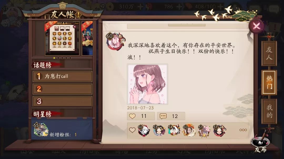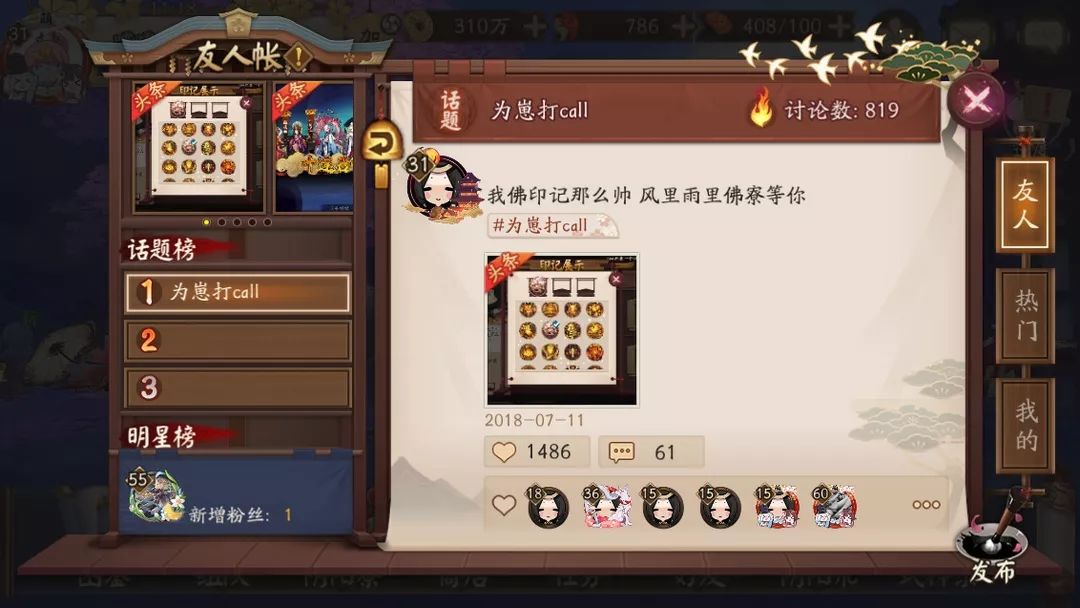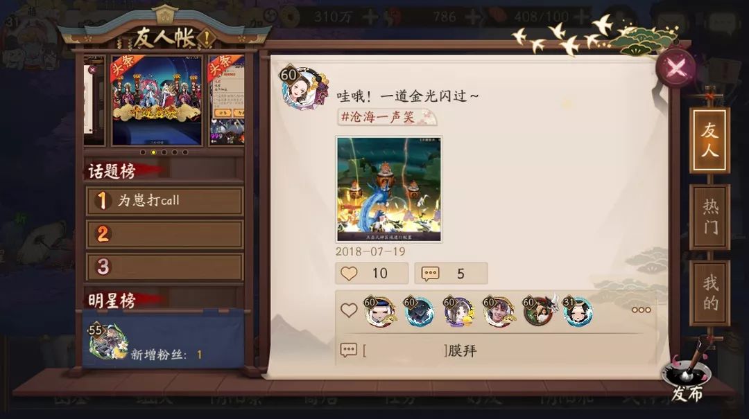 微风簇浪,绮灯缓缓升空。游人熙熙攘攘,鲤鱼旗载着希冀随风飘摇。花火骤然绽放,式神与阴阳师们齐聚京都,共同分享着平安京妙趣横生的轶闻乐事。 【全新友人帐功能上线】 8月1日维护更新后,等级达到15级的阴阳师可以通过庭院右上方入口进入“友人帐”系统。“友人帐”玩法颇多,下面寮办就为大家一一介绍! 【友人帐玩法介绍】 一、发布手账 阴阳师们可以把平安京中发生的趣事,通过图片、文字、表情和添加话题的方式发布手帐,随时记录在”友人帐”中。 另外,当阴阳师们截图分享通关副本、抽取符咒等重要时刻的时候,可以通过屏幕下方的按钮一键分享到”友人帐”~ 二、友人手帐 阴阳师们可以在“友人”中查看所有好友(包括跨区好友)、寮友和附近的人发布过的手帐,也可以通过“关注”其他阴阳师的方式,第一时间查看TA的最新手帐~ 三、热门手帐 阴阳师们可以通过点赞和评论的方式,与发布手帐的友人进行交流互动,累积点赞与评论较多的手帐将会成为“热门”手帐哦~ 四、热点推送 在每个整点,”友人帐”会更新头条、话题榜和明星榜~新增点赞与评论数最多的手帐将成为头条,并将会一直保留头条特殊标签。阴阳师们也可以在话题榜中查看当前最热门的讨论话题,点击后还可以看到该话题下的所有手帐内容并加入到讨论中。新增关注人数越多,阴阳师们越有可能上明星榜,成为平安京的明星! 五、式神手帐 式神们也将会在”友人帐”中更新手帐,分享在平安京中的轶闻趣事!阴阳师们可以在「友人」中查看式神发布的手帐,阴阳师们记得通过点赞和评论的方式,与式神们交流互动哦~ 另外,发过手帐的式神,在式神录会有特殊的「手帐」入口,方便阴阳师们查看式神发布过的所有手帐~ 游人如织,漫天花火尽情绽放;蝉鸣莺啼,遥遥晚空繁星璀璨。点点萤火与欢声笑语相映成趣。此情此景,不知阴阳师们是否心动?快拿出手账本,绘下这盛夏晚夜的佳景~ 更多精彩内容,请关注 《阴阳师》官方网站(yys.163.com)、《阴阳师》手游公众号(yinyangshi163)。 【关于《阴阳师》手游】 网易自研精品,唯美空灵的和风写意,经典的半即时回合制RPG,卡牌收集、养成,基于LBS地理技术的社交PK,上百种式神亟待觉醒,3D唯美和风手游《阴阳师》等你展开神秘的奇幻之旅…… 官方网站:https://yys.163.com 官方微信:yinyangshi163 官方微博:@网易阴阳师手游 官方TapTap:https://www.taptap.com/app/12492 官方头条号:网易阴阳师手游 官方贴吧:网易阴阳师吧 官方论坛:https://yys.16163.com/ 【关于“网易大神”】 网易大神是网易游戏旗下的精英玩家社区。这里汇聚了广大精英玩家、游戏圈红人、行业大咖,集合了网易独家的官方资讯和福利趣闻,旨在为玩家打造一个丰富的游戏兴趣社交圈。玩家可以在网易大神与游戏中的好友实时聊天、多元互动;以游戏会友,结交更多游戏同好,和大神一起发现更多游戏乐趣。 官方网站:https://ds.163.com 官方微信:wyds_163 了解更多相关信息,请前往http://www.yzz.cn/sy/yys/ |