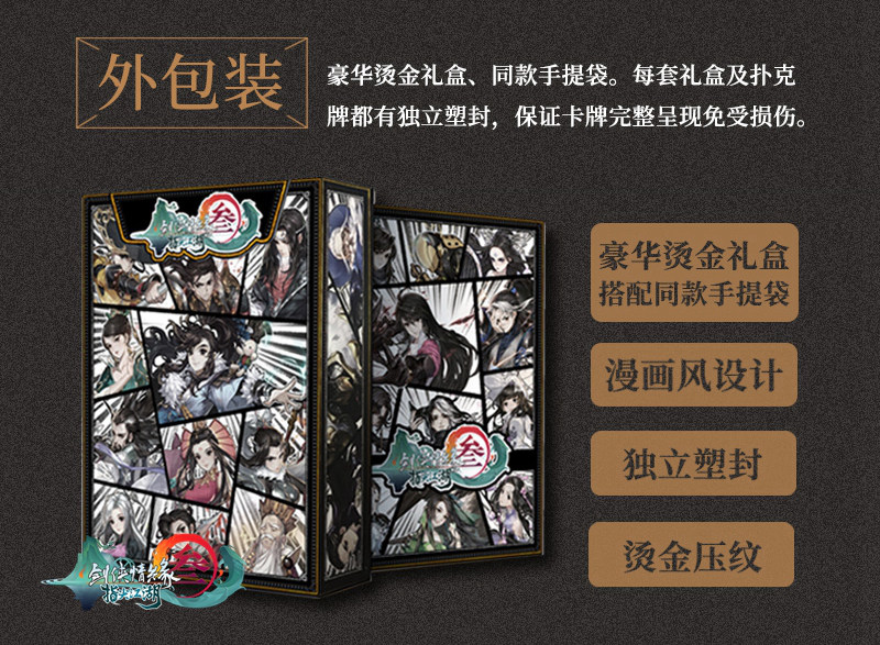 8月3日至6日,上海新国际博览中心N1馆,《剑网3》将携手《剑网3:指尖江湖》双双亮相第16届ChinaJoy西山居展台!除了各种丰富有趣的互动节目和精美好礼之外,今年《剑网3》还将在ChinaJoy上发布一款全新周边——《剑网3:指尖江湖》典藏版扑克牌! 【指尖江湖 跃然纸上】 《剑网3:指尖江湖》典藏版扑克牌含54张常规卡牌和2张隐藏人物彩蛋牌。卡牌背面精选《剑网3:指尖江湖》场景元素,采用经典的黑金色搭配,并在图案中的圆月边缘使用了玫瑰金烫金工艺,使得卡牌背面层次丰富低调奢华。 典藏版扑克牌卡牌正面则采用了《剑网3:指尖江湖》的经典角色形象,共有28位人物角色分饰两款不同造型跃然纸上,56张卡牌牌面张张不同!7*10CM的大尺寸卡面彰显精美人物造型,在方便各位侠士玩转指尖的同时也极具珍藏价值。除了这28位经典角色,典藏版扑克牌中还有一位隐藏人物等你发现哦! 【匠心品质 珍藏首选】 《剑网3:指尖江湖》典藏版扑克牌纸张材质选用了国际专用的扑克牌制作纸张,进口黑芯纸!黑芯纸共有三层结构,厚实耐折,不仅手感柔韧顺滑,兼具良好弹性的同时还不易变形,更能防透视防透光防作弊! 在印刷工艺上,典藏版扑克牌选用了德国原装进口的海德堡印刷机印刷,在保证画面清晰颜色鲜亮的同时,其环保材质印刷的方式也无刺激性气味产生,让诸位侠士可以安心使用。 扑克牌的卡牌牌面有平行纵横压纹,呈现出自然哑光状态。其采用的单独冲压锁边工艺也可以使扑克牌经久耐用不起毛边,方便诸位侠士痛快出牌! 【精致包装 馈赠佳品】 如此匠心品质的扑克牌,怎能没有一个高端大气上档次的包装礼盒相匹配呢?《剑网3:指尖江湖》典藏版扑克牌配备有专属豪华定制礼盒一个,每套礼盒及扑克牌都采用独立塑封,保证卡牌免受损伤的同时完整呈现出最亮眼的展示效果。 典藏版扑克牌专属豪华定制礼盒,在设计上采用了《剑网3:指尖江湖》经典人物角色的漫画风格拼接,并在暗色漫画风表面增加亮眼细节。整个礼盒边缘采用烫金压纹工艺,彰显奢华品质。 典藏版扑克牌专属豪华定制礼盒还配有同款画风高档手提袋,让每位侠士提在手中都倍儿有感觉,拿来馈赠亲朋好友,也绝对是拿得出手的高级定制周边! 本周末,《剑网3》将携手《剑网3:指尖江湖》双双亮相第16届ChinaJoy西山居展台!《剑网3》系列制作人郭炜炜还将于8月4日空降活动现场,与全体侠士亲密互动!上海新国际博览中心N1馆,让我们一起HIGH翻全场! 《剑网3》官网:jx3.xoyo.com |