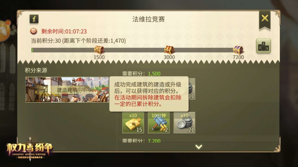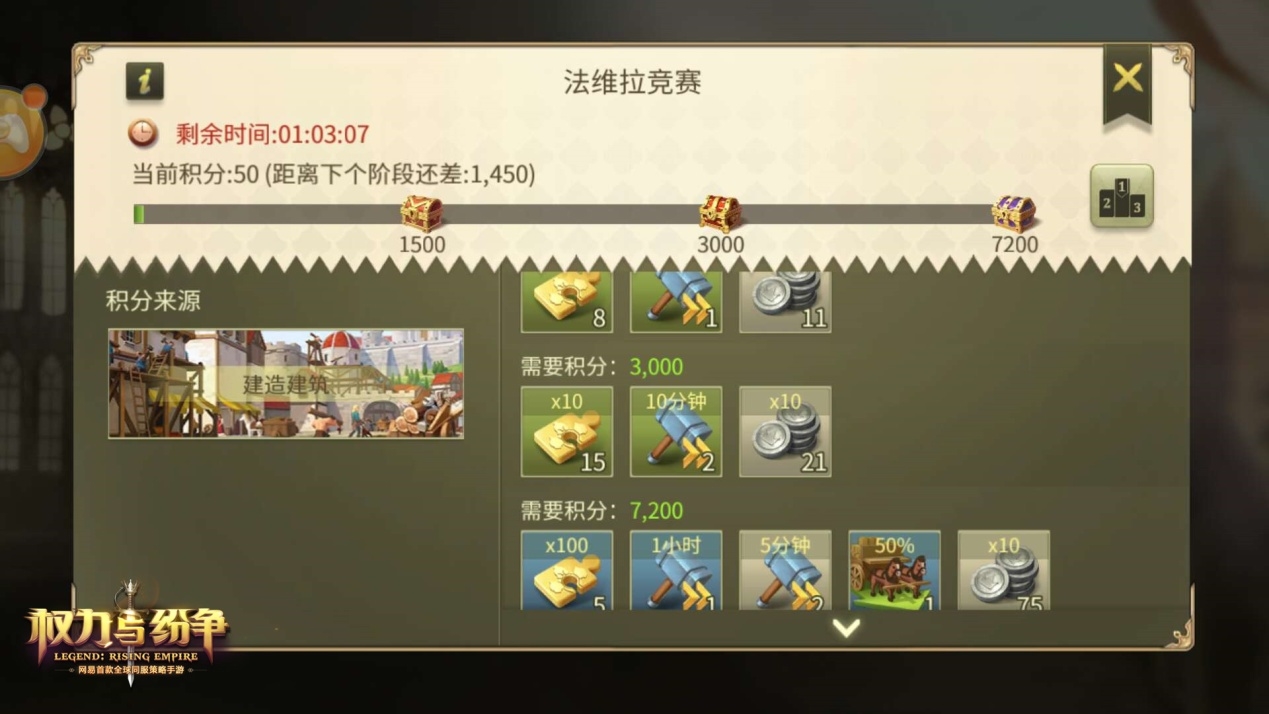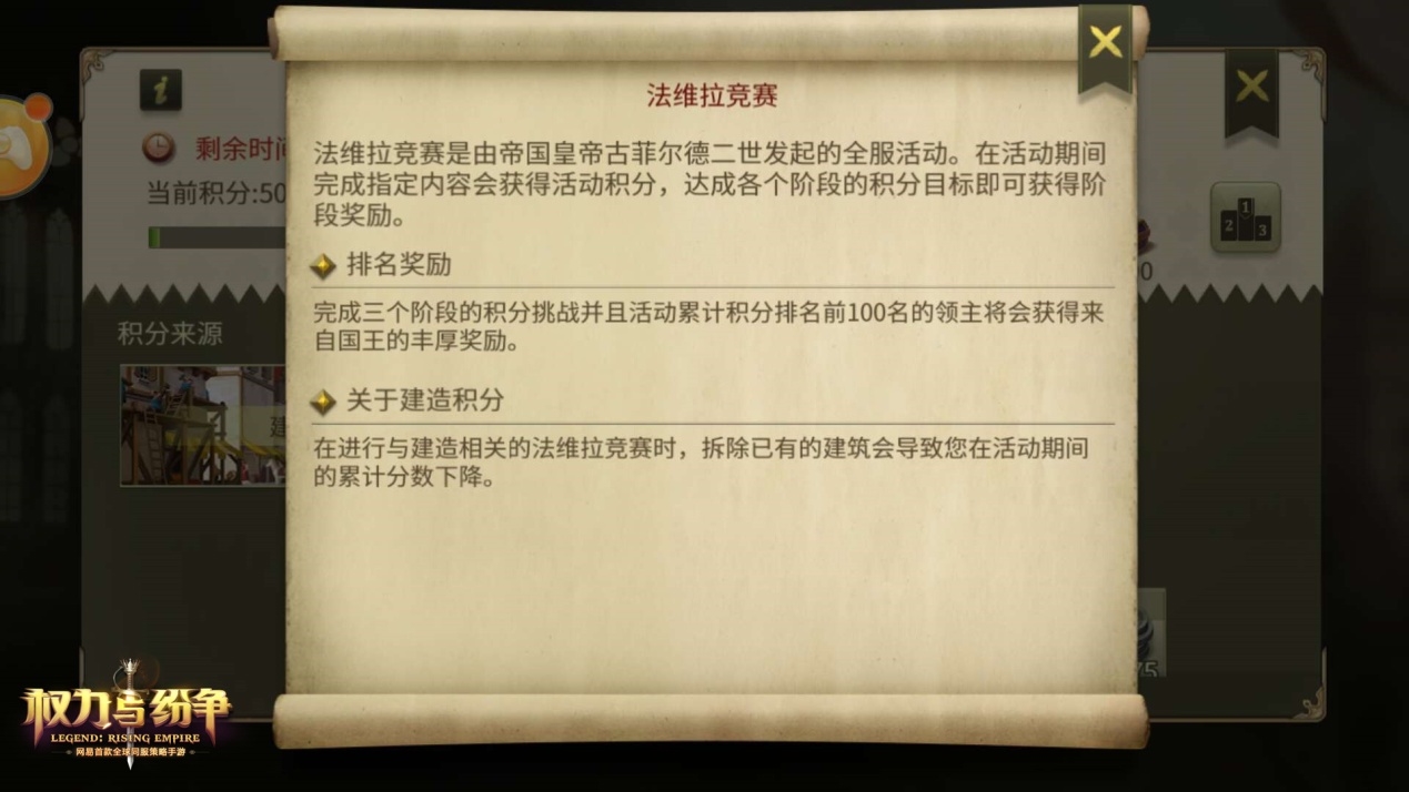 积分竞争,从现在开始!网易首款全球同服策略手游《权力与纷争》已震撼开测,第二次计费删档测试正在火热进行中。在广袤的法维拉大陆上,除了真刀真枪的战争之外,日常的积分竞赛亦是一种展现自己强大的方式。对于领主们而言,全新上线的“法维拉竞赛”玩法,将为所有玩家带来丰厚的日常福利,同时,还将为广大领主们提供一个竞赛实力的舞台,快来一同了解一番吧! 一争高下,法维拉竞赛玩法登场 随着《权力与纷争》第二次安卓计费删档测试的火热开启,这款网易首款全球同服策略手游凭借其真实城市模拟玩法、多兵种实时战场、创新的社交玩法等特色,吸引了大批热爱SLG的玩家入驻,而在二测中全新上线的“法维拉竞赛”玩法,更是为玩家们增添了别样的游戏乐趣! 法维拉竞赛是面向全服玩家定时开启的日常单人积分活动,每间隔一定周期便会开启1次。玩家需要在短时间内达成指定的游戏目标,即可获得积分。 按照活动类型的不同,法维拉竞赛的任务分为建造任务、研究任务、强盗任务以及综合任务。 具体而言,建造任务可通过新建、升级建筑来获取积分,研究任务则是通过研究科技来完成,而综合任务则是融合了建造与研究的部分,玩家可以用建造建筑或升级科技的方式来获取综合任务的积分。至于强盗任务,则需要玩家击败野外强盗或野外营寨来获得积分。 活动的奖励分为3个阶段,随着积分的提升,玩家所获得的奖励也将越来越丰厚,每次玩家达到对应积分后,系统将通过邮件对玩家发放对应阶段的奖励。 此外,每次活动的阶段奖励都会有所不同,部分活动阶段三完成后还可获得橙色侍从——柏妮丝?奥利薇娅?法尔维克的碎片!该侍从提供的天赋能够提升全体士兵的生命值,极大的提高部队的作战能力。作为唯一获取该侍从的途径,多多参与法维拉竞赛活动将有助于领主们早日招募这位优秀的侍从,而她将为领主们带来强大的助力! “法维拉竞赛”的限时要求对玩家们来说将是一项不小的挑战,需要玩家对建设时间、土地、兵力、行动力等因素有很好的计算。以建造建筑任务为例,玩家可以购买新土地为新建筑腾出空间,也可以选择在任务刷新前拆除不必要的低级建筑,避免扣除积分的同时,增加了可建设的土地。此外,开始了新建设之后,玩家还需要注意建筑之间的互斥与关联性,尽量将资源发挥到极致,并且合理的使用加速道具来加快进程,从而完成一场高效而精彩的“竞赛”! 正如列强之间的军备竞争,“法维拉竞赛”同样是一场全服级别的实力较量。在活动结束后,系统会根据玩家目标达成的情况进行积分统计,前一百名的佼佼者将能够荣耀上榜并领取丰厚的排名犒赏,向所有人展示自己的强大国力! 看到这里,你是不是已经按捺不住想要与列强们一争高下了呢?如今,《权力与纷争》第二次安卓计费删档测试正在火热进行中,快来下载游戏,加入争霸行列,体验“法维拉竞赛”的独有乐趣吧! 帝国崛起,为王座而战!《权力与纷争》二次测试火热开启,全新法维拉竞赛活动上线,提升积分力争上榜,还能赢取丰厚福利,快快进入游戏体验吧!关于游戏的更多玩法、更多精彩内容,请关注相关后续报道。 了解更多相关信息,请前往http://sy.yzz.cn/qlyfz/ |