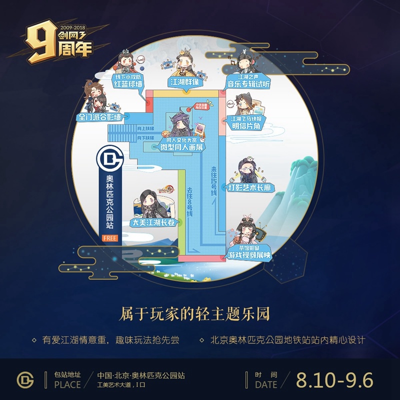 九载同路,剑指江湖,《剑网3》九州年线下庆典即将于8月26日至8月28日在北京水立方隆重举行,全网直播与侠士携手庆生。庆典活动包含发布会内场(水立方比赛大厅)和嘉年华外场(水立方多功能大厅)两个活动区,8月10日-9月6日,《剑网3》为诸位侠士提前准备了一份神秘豪华大礼——搭建于北京地铁8号线与15号线换乘站-北京奥林匹克公园地铁站站内的《剑网3》轻主题乐园,并于今日正式点亮!诸多布景高度还原游戏特色,为侠士破壁重现大唐江湖! 由《剑网3》精心设计的北京奥林匹克公园地铁站主题乐园包场活动于今日起至2018年9月6日抢先开放!这是一个专属于侠士的轻主题乐园,有爱江湖情意重,趣味玩法抢先尝。侠士可从工美艺术大道I号口进入,穿越全景大唐,携手共赴周年之约! 同时,为了能够让侠士更好的参观本次地铁主题乐园,《剑网3》为侠士们量身定制了一份详细的畅玩攻略,就让我们一起来看看吧! 九周年庆典即将到来,众多大咖齐聚线下,海量内容现场爆料,一场史无前例的视听盛宴即刻开启,诸多内容彰显诚意!更多爆料后续放出,敬请期待! 《剑网3》官方网站: jx3.xoyo.com |