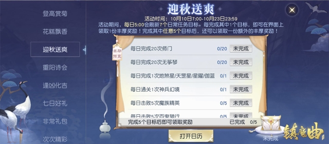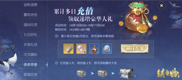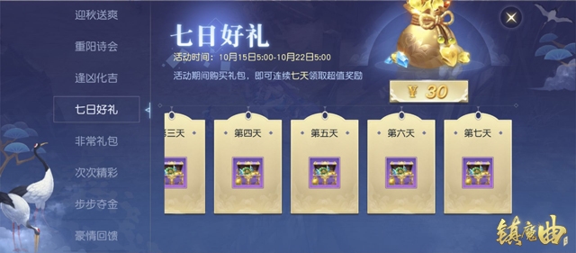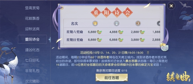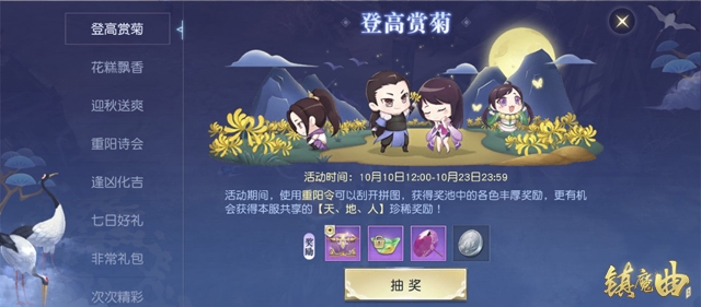 又逢九九重阳到,网易角色扮演治愈系MMO《镇魔曲》,登高赏菊、赛诗会友,吃上美味的桂花糕、喝着香醇的菊花酒,在中州大地上共醉重阳!即日起至10月23日,多重活动起上阵,高级装备、珍稀道具等奖励丰富多样,还有最高8888绑定元宝等着天命者们领回家! 登高赏菊:涅槃传奇装备、周边纸伞派送 重阳佳节秋高气爽,登高赏菊尽揽美景。利用“重阳令”,天命者们可以参与“登高赏菊”刮刮乐活动,除了赢取各类珍稀奖励外,还有8888绑元、涅槃传奇装备及《镇魔曲》周边纸伞等大礼送上!人人都有机会,一切都靠运气! 花糕飘香:亲手制作重阳糕,丰厚奖励带回家 重阳佳节自然要吃上一块美味的桂花糕。活动期间,天命者们每天都可以帮助石头制作重阳糕,筹备、上交他需要的材料,即可领到海量经验、银币、重阳令等丰厚奖励! 迎秋送爽:参与日常玩法,额外福利轻松拿 “迎秋送爽”活动里,天命者们只需要参与师门、无筝琴、天罡地煞等日常活动玩法,即可领取《镇魔曲》送上的额外福利!海量银币、经验、重阳令等应有尽有,完成5个日常任务目标还有丰厚的额外福利送上,不要错过咯! 重阳诗会:赛诗答题,绑定元宝免费领 10月20、21日周末两天,晚上19点至19点30“重阳诗会”将与天命者们见面!活动期间每隔2分钟便会有60位诗酒侍者出现在天阙王城,答对诗谜问题即有丰厚奖励领取,每天排名前10的天命者还有最高8888绑定元宝的巨额奖励!才高八斗的天命者们,到这里一展所学、力压群雄吧! 逢凶化吉:挑战试炼之主,魂珠、重阳令天天有 佳节到来,中州上下结彩张灯,然而魔族也不忘添乱。两位强大的试炼之主降临凡间,为了保证重阳佳节的和美平安,天命者们需要组成5人队伍将其击退。每天首次击退两位试炼之主,即有重阳令、魂珠、海量经验银币等奖励,回馈给勇保中州平安的天命者们! 充值返利、超值礼包,系列活动优惠多 除了五重福利奖励丰厚的活动,“共醉重阳”活动期间《镇魔曲》还为天命者们送上了充值返利、超值礼包等超多优惠! “非常礼包”限时上架,全新挂饰重阳开抢;“七日好礼”超值放送,绑定元宝、银币、重阳令一个不落! 还有“次次精彩”、“步步夺金”、“豪情回馈”三重返利,只要充值指定档位、累计金额或累计天数,即有六个阶段的不同福利送上! 活动丰富、趣味不同,福利奖励拿到手软!《镇魔曲》“共醉重阳”火热进行中,天命者们,一起到中州世界登高赏菊、一醉方休吧! 关于《镇魔曲》手游: “在最美的时光,遇见最好的我们”——治愈系MMO镇魔曲,2018年度资料片《治愈系?初见》今日上线!七大法宝体系解封,苍梧之上琉璃境现世,更有上市来首个新职业“殊音”登场。七大职业、十大主角、21个战斗流派,“战法牧”组团开荒。交易?师徒?夫妻?家园,真实关系温情陪伴! 官方网站:https://zm.163.com 官方微信公众号:zhenmoqu_neo 官方微博:镇魔曲手游 官方论坛:https://zm.16163.com 网易大神号:镇魔曲手游 了解更多相关信息,请前往http://game.yzz.cn/html/info-1112.html |