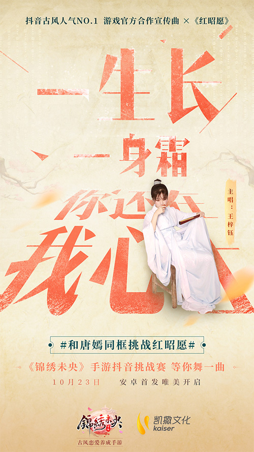 嫣然一笑,为爱心动。心动女神“唐嫣”倾情代言,电视剧正版授权的古风恋爱养成手游《锦绣未央》将于10月23日安卓首发,今日游戏官方合作宣传曲《红昭愿》正式公布,主唱王梓钰为游戏站台送祝福!古风神曲来袭,点燃女神热情,唐嫣李未央同框跳《红昭愿》,开启抖音有奖视频挑战赛,等你来挑战抖音神曲,更准备百万量级传播资源助你C位出道!更多惊喜尽在《锦绣未央》手游,赶紧抓住游戏预约的尾巴,凡参与预约的玩家都有机会成为“锦绣锦鲤”收获大奖。 抖音爆红神曲《红昭愿》主场站台,完美融合“锦绣古风文化” 此次《锦绣未央》手游安卓首发,官方特签约与游戏意境完美融合的抖音神曲《红昭愿》,主唱王梓钰更是为游戏站台送上祝福。2018年黑马神曲——《红昭愿》,相信玩抖音的朋友对这首歌都不陌生。其动听旋律、优美歌词,深受广大网友的喜爱,被冯提莫、银临等网络红人翻唱,掀起一股古风热潮。《红昭愿》是音阙诗听音乐社的原创作品,由音阙诗听主唱王梓钰演唱,连续数月蝉联主流音乐平台热歌榜、抖音等短视频平台热歌榜。 《锦绣未央》手游唯美古风场景、浪漫恋爱养成的游戏特色,与古风神曲《红昭愿》意境完美融合。游戏官方合作宣传曲《红昭愿》,古风缭绕曲意浓,使游戏中“宫廷纷争,佳人相守”的剧情得以完美展现,让游戏古风韵味更加浓烈。 唐嫣李未央同框跳《红昭愿》,抖音神曲等你来挑战 《锦绣未央》手游是一款由唐嫣倾情代言的古风恋爱养成手游,自内测以来收获了不俗的人气,此次选择古风神曲《红昭愿》作为官方合作宣传曲,可谓是强强联合。 为迎接游戏10月23日安卓首发上线、代言人唐嫣入锦绣,让每个玩家都有机会被心动女神唐嫣“捧在手心”,《锦绣未央》手游开启#和唐嫣同框挑战红昭愿?#有奖视频挑战活动!10月18日起,添加话题#和唐嫣同框挑战红昭愿# 上传自己跳《红昭愿》舞蹈或者手指舞等视频参与挑战。甜美女神唐嫣、古风神曲《红昭愿》助力超级挑战,不论你是技术派,还是颜值派,快来与唐嫣尽情舞一曲,创作更多搞怪、温馨的作品参与挑战吧! 参与抖音超级挑战,全网资源助你C位出道 俗话说:没有奖励的活动就是耍流氓!作为《锦绣未央》手游首个抖音超级挑战活动,主办方可以说是有钱有资源又任性。参与抖音挑战点赞数最高者将获得,YSL口红心动套装(四只装)一份,唐嫣亲笔签名照一张,更有《锦绣未央》手游百万级传播资源助你C位出道,要你红! 《锦绣未央》手游百万级传播资源列表(包括但不限于): 1、《锦绣未央》手游官方全平台推荐(抖音、官网、微博、微信、贴吧、玩家群等); 2、游戏行业顶级媒体全推荐(游资网、游戏茶馆、18183,17173、今日头条、搜狐、新浪游戏、琵琶网等); 3、视频网站重点推荐(腾讯、优酷、爱奇艺、B站、抖音等); 4、更多优质资源传播; 10月18日,打开你的抖音,搜索#和唐嫣同框挑战红昭愿?#进入挑战,用作品说话,惊喜大奖等你来拿,C为出道就是你! 唐嫣甜美可人的形象,再搭配撩人心弦的宣传曲《红昭愿》,怎能不让人心动。《锦绣未央》手游将于10月23日安卓首发上线,唐嫣邀你共赴锦绣世界。这个10月,《锦绣未央》手游绝对值得你期待!目前《锦绣未央》手游正在全平台火爆预约中,小主们赶快前往《锦绣未央》手游官网(http://jxwy.ksgame.com/)、苹果商店和安卓平台各大应用商店预约游戏,就有机会领取海量预约福利,让你盆满钵满! 关于《锦绣未央》手游 心动女神“唐嫣”倾情代言,邀您加入古风恋爱养成手游《锦绣未央》!《锦绣未央》由百亿剧王同名电视剧正版授权,游戏基于唯美古典画风,为玩家带来50万字未知剧情探索、13个脸部细节高自由度捏脸、近100套华丽服装更换,以及怦然心动恋爱养成、独具个性府邸装扮、轻松有趣封地治理等近20个特色玩法,呈现一个唯美多彩的古风恋爱养成世界。 游戏官网:http://jxwy.ksgame.com 游戏微信公众号:锦绣未央手游-jxwygame 官方抖音号:锦绣未央手游(jxwy888) 游戏官方微博:锦绣未央手游 官方QQ群1群:414279620 官方QQ群2群:331714736 了解更多相关信息,请前往http://game.yzz.cn/html/info-2213.html |