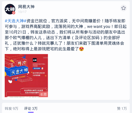 近日,一条高达8层楼,写满了游戏装备和周边礼包的条幅出现在杭州网易园区,引来了不少围观。 (网易CEO丁磊也在网易大神上转发了相关动态) 条幅上不乏外星人电脑、英伟达显卡、任天堂switch等顶配奖励,现场的路人纷纷驻足拍照,还分享到朋友圈,表示这是“本年度游戏肥宅最心动的奖励”。 那么这条40米高,写有“网易大神恭祝天选大神喜提大礼包”的横幅到底是什么来头? 原来,这是一款名为网易大神APP发起的“寻找天选大神”活动,海量的游戏外设、周边手办等奖励堪称是“游戏界顶配礼包”,掀起了一股刷屏热潮。 更有有心人计算出,该条幅上有包含《梦幻西游》《阴阳师》,网易云音乐,网易考拉工厂店等网易旗下产品,及英伟达、宏碁、北通等共计54个品牌友情赞助的奖品约170余件,承包了游戏宅的衣食住行。 目前,这个活动在大神APP上转发已近十万,这不禁令人期待,一举夺得条幅上的“天选大神”到底会花落谁家?10月23日,还将有神秘大咖开奖,感兴趣的网友不妨到网易大神上看看谁会是那个“天选大神”吧! |