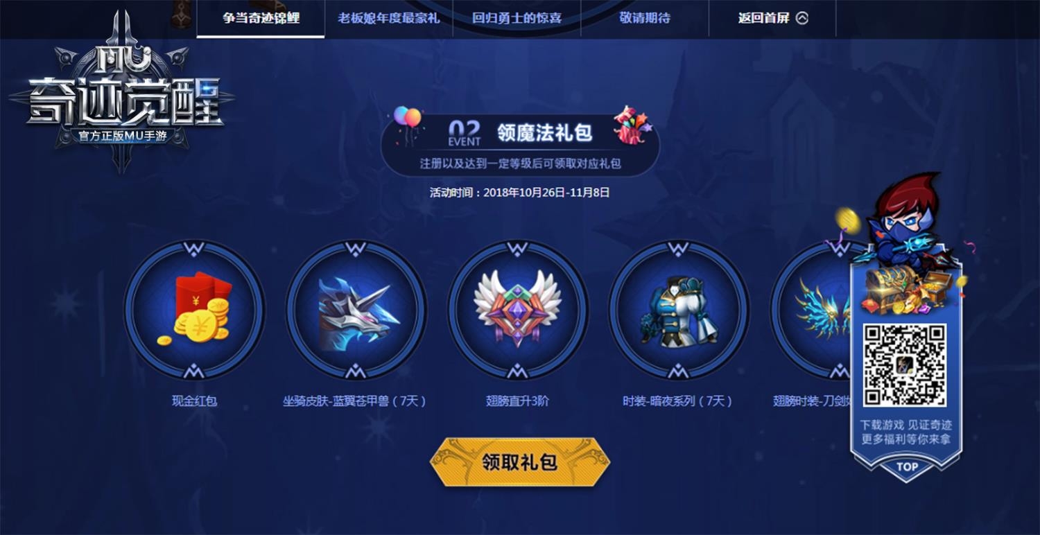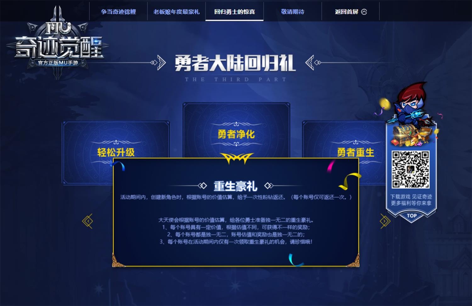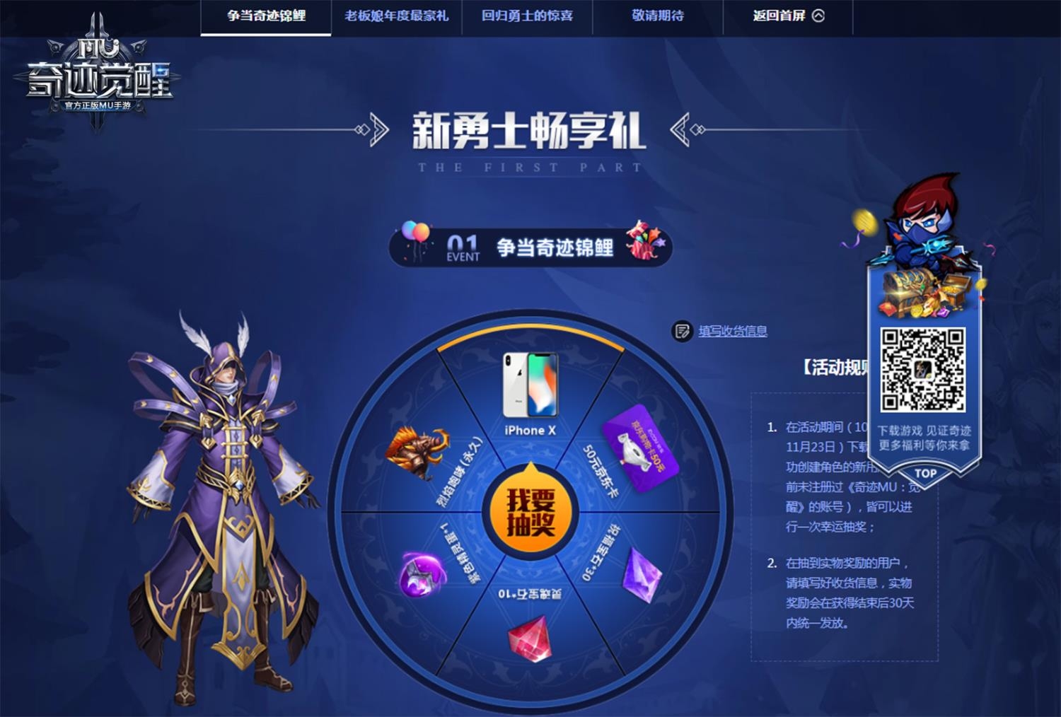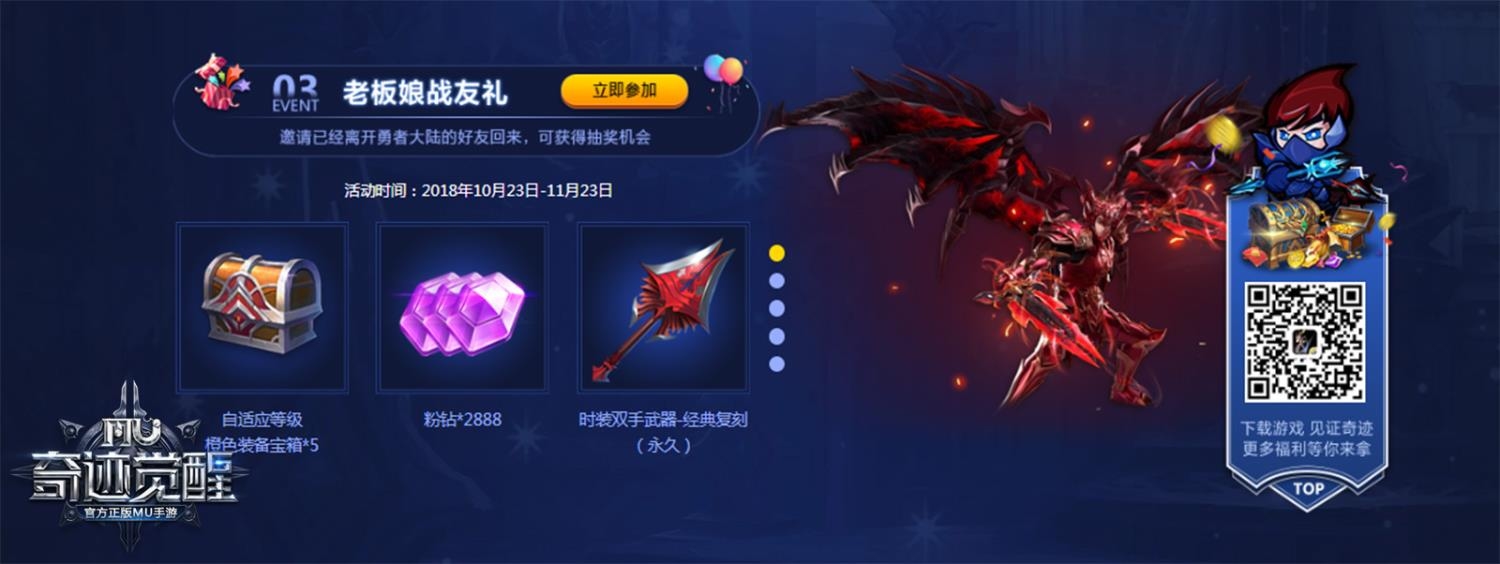 全新MMO官方正版奇迹手游《奇迹MU:觉醒》魔剑公测,魔剑士职业经典归来,更有全新地图、自由转职、元素之灵、坐骑觉醒、技能觉醒等全新内容批量开放。与此同时,《奇迹MU:觉醒》也为玩家们准备了丰厚的庆典福利,让玩家们能在享受全新战斗的同时,也能感受到全新公测版本的狂欢气氛和得到更多福利奖励。 全民福利盛典:https://qjjx.qq.com/cp/a20181014suspense/index_p.shtml 新勇士入驻畅享礼 争当奇迹锦鲤 你是备受幸运女神眷顾的奇迹锦鲤吗?官宣!这里有壕礼等待着你。即日起至11月23日活动期间,下载游戏并成功创建角色的新用户(此前未注册过《奇迹MU:觉醒》的账号),均能够获得一次幸运抽奖的资格,有机会将iPhone X、烈焰咆哮(永久)、紫色精灵蛋等丰厚奖励直接收入囊中。独乐乐不如众乐乐,新勇士在注册游戏后还可以邀请好友注册游戏,将获得额外的抽奖机会。 之后,新勇士在注册并达到活动指定的等级要求时,还可以领取到对应的游戏礼包。 惊喜连弹 老板娘年度豪华礼放送 喜迎魔剑公测,小酒馆的老板娘也坐不住了,特地备上年度最豪礼回馈广大玩家。 礼包第一弹:老板娘最豪礼,即日起至10月29日活动期间,玩家累计登录就送永久时装;礼包第二弹:老板娘助力礼,即日起至11月23日活动期间,玩家邀请未注册过游戏的好友下载并完成注册,即可获得抽奖机会;礼包第三弹:老板娘战友礼,即日起至11月23日活动期间,玩家邀请已经离开勇者大陆的好友回归,同样可以获得抽奖机会。 除此之外,截止至10月29日,游戏每每天还将开放四重福利活动,包括限时启动的天降经验雨,每日的魔剑士膜拜,各活动奖励的战盟贡献经验双倍加成,以及组队队伍中每存在一个魔剑士职业,即可增加1%的击败怪物经验加成。 回归勇士的惊喜 专享四重缤纷礼 对于因为各种原因暂时别离游戏又重返勇者大陆的回归勇士,《奇迹MU:觉醒》特别进行了量身打造,重磅推出四重福利。活动期间回归有特权,回归老角色加速升级,进度不愁,创建新角色贴心送上高倍经验卡,助力玩家更快度过新手期。此外,老玩家重新创建新角色,可选择想要重生的老服的角色,根据老服角色等级,游戏将会给予一次性粉钻返还。新角色在达到指定等级时还可以获得抽奖机会,奖品包含全身装备追加直升礼包、圣辉直升礼包、坐骑等级直升礼包等。 《奇迹MU:觉醒》魔剑公测火爆开启,魔剑觉醒归来,庆典活动批量开放,全民狂欢享福利,全新的战斗篇章已经拉开帷幕,新的奇迹正等待着勇士们前来续写。 关注《奇迹MU:觉醒》公众号,获取游戏更多信息 公众号二维码(微信号:qjjxmu) 加入《奇迹MU:觉醒》官方QQ群,兄弟在这里等你回来 QQ群号:600940180 点击链接mu.qq.com进入《奇迹MU:觉醒》游戏官网 关于《奇迹MU:觉醒》 《奇迹MU:觉醒》是由腾讯独家发行,韩国网禅正版授权、掌趣科技成员天马时空研发的全新官方正版授权奇迹手游。游戏用更加华丽的画面,完美重现了勇者大陆、亚特兰蒂斯、天空之城等玩家熟悉的地图,同时经典职业也将回归称霸勇者大陆。在基于延续传承的同时,游戏还带来了与时俱进的创新,玩法进一步升级,除了将端游恶魔广场、血色城堡、卡利玛神庙等玩法深度还原之外,还新增更多原创玩法,让玩家享受更多的冒险乐趣。 了解更多相关信息,请前往http://game.yzz.cn/html/info-6606.html |