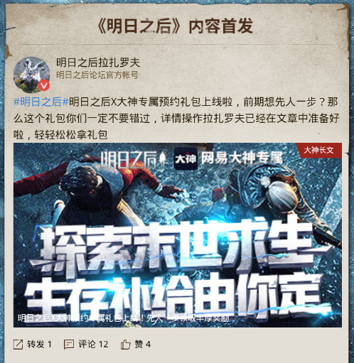 活下去,一起!病毒末世下的人类生存手游《明日之后》即将全平台上线,网易大神预约通道正式开启。即日起至11月5日,进入《明日之后》发现专区,不仅可以浏览专区新手攻略、同人小说等精彩内容,还可领取专属物资礼包,多重生存补给由你定,助你对抗末世! 点击领取补给:https://ds.163.com/2018/mrzh/appointment/ 千万玩家期待的《明日之后》手游将于11月2日iOS首发、11月6日安卓全渠道上线。网易大神《明日之后》专区正式开启,同时开放专属预约通道,邀请各位幸存者共同探索末世秘密。只需登录网易大神APP,在“发现”页的《明日之后》专区即可进入预约页面预约游戏。 幸存者们可在预约通道中自由选择礼包内容,届时可在游戏邮箱中领取并借此存活。第一重、第二重礼包现已开放领取,第三重礼包将于10月30日开放,马上登录网易大神APP定制你的专属生存补给,在末世之中生存下去。 网易大神《明日之后》专区还为幸存者们提供了萌新必备攻略、同人小说等精彩内容,搜索并加入《明日之后》相关群聊更可结识同伴共闯末世。饥荒、丧尸、斗争……直面恐惧,和网易大神一起携手对抗病毒末世! 【关于“网易大神”】 网易大神是游戏热爱者的兴趣圈。这里汇聚了广大精英玩家、游戏圈红人、行业大咖,集合了网易独家的官方资讯和福利趣闻,旨在为玩家打造一个丰富的游戏兴趣社交圈。玩家可以在网易大神与游戏中的好友实时聊天、多元互动;以游戏会友,结交更多游戏同好,和大神一起发现更多游戏乐趣。 官方网站:https://ds.163.com 官方微信:wyds_163 官方微博:@网易大神APP 官方大神号:@网易大神 了解更多相关信息,请前往http://sy.yzz.cn/mrzh/ |