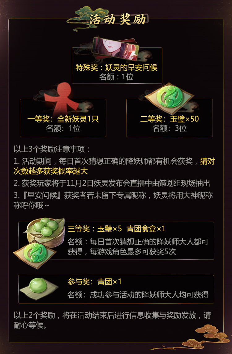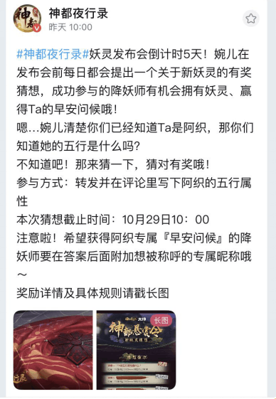 新妖灵即将登陆《神都夜行录》,网易大神新妖灵猜想活动火热进行中。在11月2日发布会前,网易大神APP《神都夜行录》官号每日都将公布一个关于新妖灵的猜想话题,各位降妖师大人只需转发并在评论中参与猜想,就有机会把新妖灵和其他丰厚好礼抱回家。奖励人人有份,永不落空! 【揭猜想悬赏令 领丰厚好礼】 新妖灵猜想活动现已开启,海量奖励等你来拿。即日起至11月2日10:00,所有降妖师大人都可以到网易大神APP@神都夜行录 大神号查看关于新妖灵的每日猜想话题,在规定时间内转发猜想话题动态并在评论中留下你的答案,即可参与活动。 在每条猜想话题动态中,官方都将附上与问题相关的配图作为提示,帮助各位降妖师大人猜出正确答案,赢取丰厚奖励。所有猜想话题的最终答案都将在新妖灵发布会直播中揭晓。 所有成功参与活动的降妖师都将获得青团作为奖励,每个内容第一次猜想正确的降妖师更可获得玉璧和青团食盒。此外,官方将会在11月2日的直播中从所有猜对的玩家里随机抽取5位幸运的降妖师,送出新妖灵告的早安问候、新妖灵或玉璧等丰厚奖励。 【看发布会直播 轻松读懂新妖灵】 11月2日晚,《神都夜行录》全新妖灵发布会将在网易CC进行。届时,官方不仅会公布大神有奖猜想活动中的正确答案,还将介绍关于新妖灵的更多其他资料,降妖师大人们在观看直播的同时参与抢评还有机会获得玉璧及青团食盒! 新妖灵的技能是什么?新妖灵的定位是什么?新妖灵经历过了什么?看完发布会直播后这些问题都将迎刃而解。全新妖灵轻松掌握,感兴趣的降妖师大人们千万不要错过哦! 除了这次的妖灵发布系列活动外,网易大神还将为所有降妖师大人们准备更多活动,帮助大家成为《神都夜行录》中的佼佼者!关注网易大神@神都夜行录 大神号,最新资讯、最爽福利一手掌握! 【关于“网易大神”】 网易大神是游戏热爱者的兴趣圈。这里汇聚了广大精英玩家、游戏圈红人、行业大咖,集合了网易独家的官方资讯和福利趣闻,旨在为玩家打造一个丰富的游戏兴趣社交圈。玩家可以在网易大神与游戏中的好友实时聊天、多元互动;以游戏会友,结交更多游戏同好,和大神一起发现更多游戏乐趣。 官方网站:https://ds.163.com 官方微信:wyds_163 官方微博:@网易大神APP 官方大神号:@网易大神 了解更多相关信息,请前往http://sy.yzz.cn/sdyxl/ |